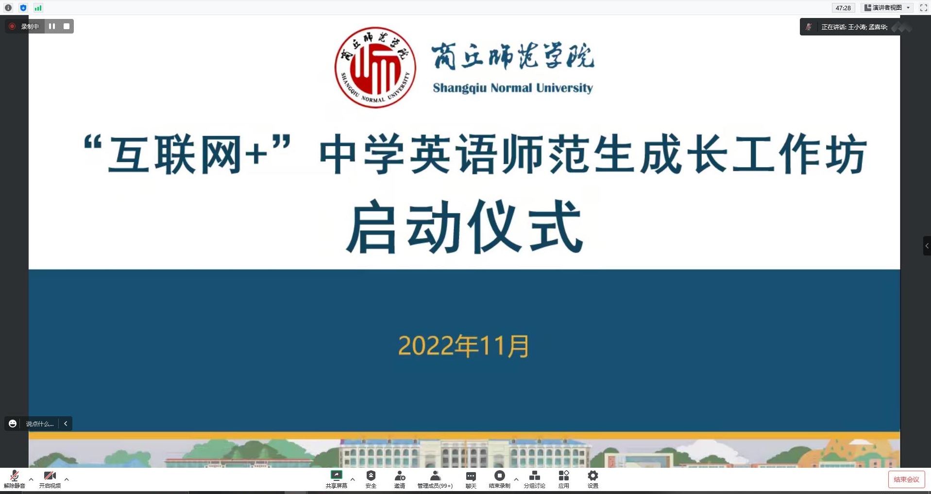 为了2022-2023学年度“互联网+”中学英语师范生成长工作坊工作的顺利开展,11月18日晚上七点整,天天精品视频免费观看举办了“互联网+”中学英语师范生成长工作坊启动仪式。商丘市基础教育教学研究室英语教研员吕红梅老师、11位来自一线中学英语教学岗位的工作坊坊主出席了启动仪式,天天精品视频免费观看院长孙艳玲教授、天天精品视频免费观看副院长孟喜华老师、英语系副主任张晗老师、工作坊全体坊员参加了此次活动。本次活动由英语系主任王小涛博士主持。