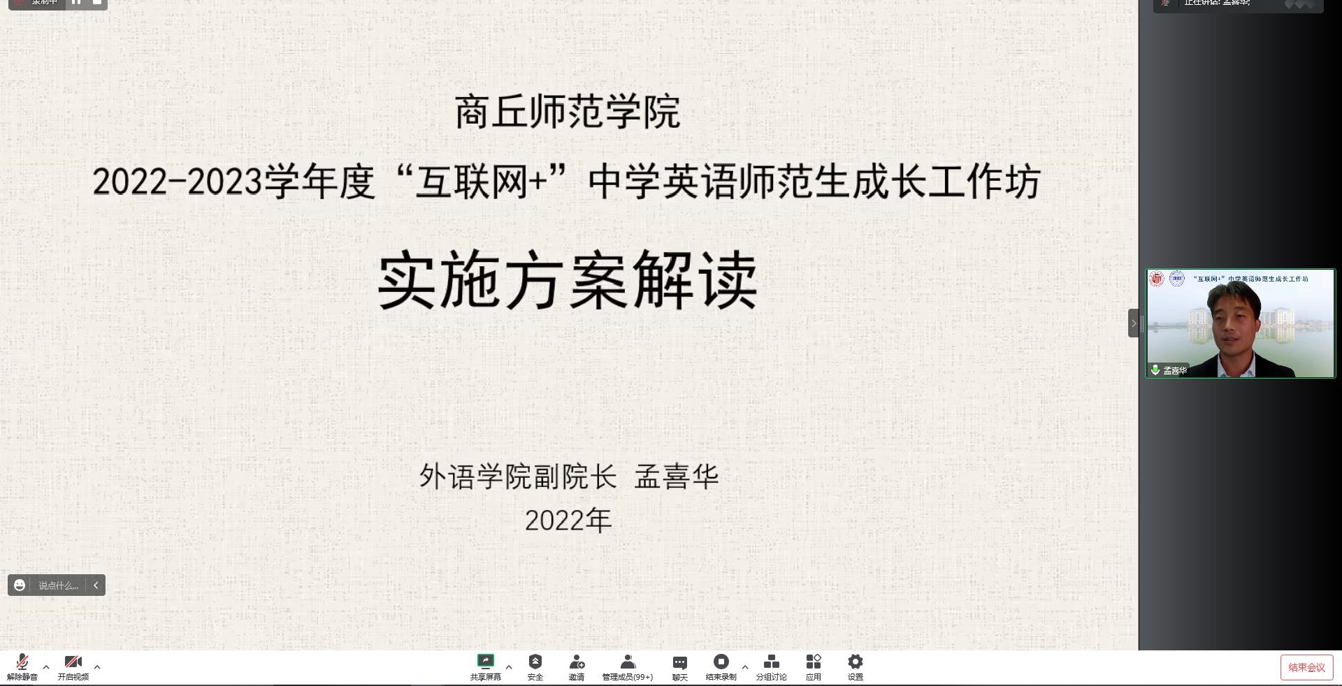 最后,孟喜华副院长详细解读了本学年“互联网+”中学英语师范生成长工作坊的实施方案,明确了坊主、坊员和校内指导教师在整个实践过程的任务和各项实践环节的时间节点。