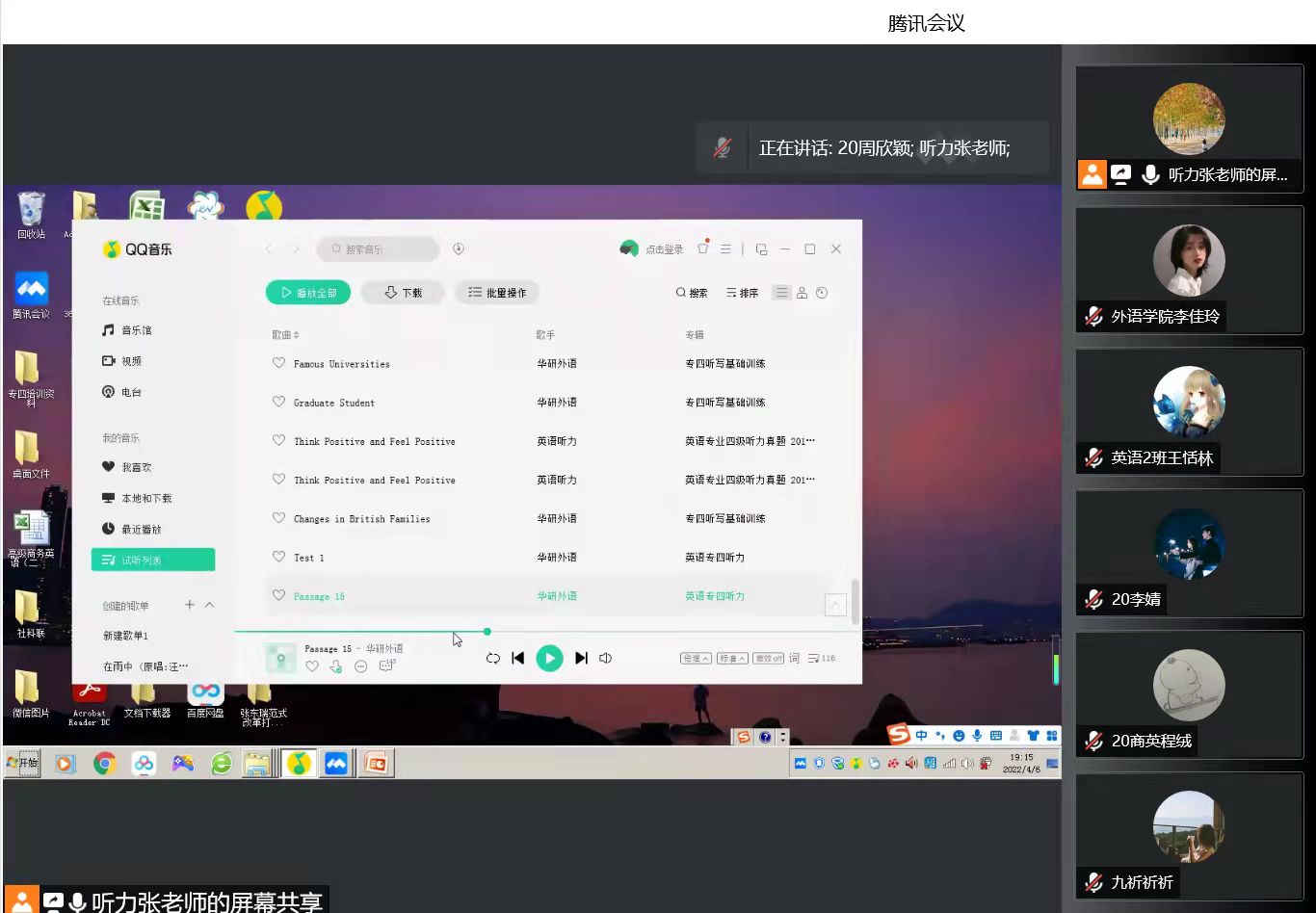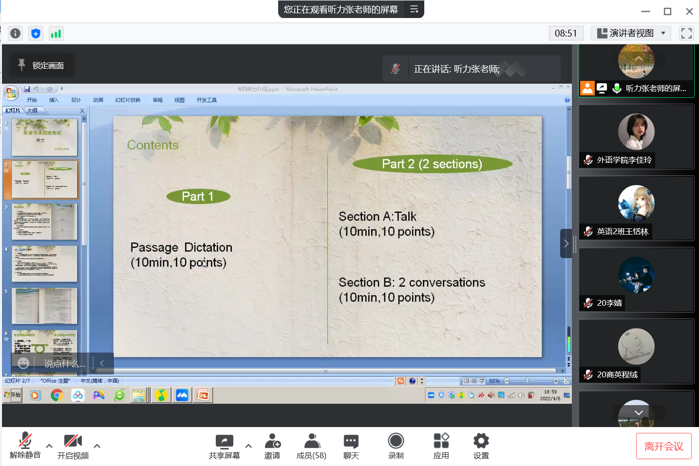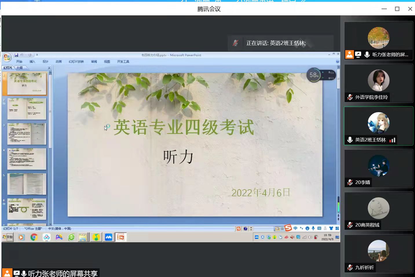为了解决天天精品视频免费观看英语专业2020级学生英语类专业四级考试备考困难,帮助学生更好地进行考前准备,切实提升学生的英语水平和能力,提升天天精品视频免费观看人才培养质量,天天精品视频免费观看计划于2022年4月开展“英语能力提升计划”活动。4月6日晚,天天精品视频免费观看“英语能力提升计划”活动之——英语专业四级考试听力辅导由张东瑞老师主讲。