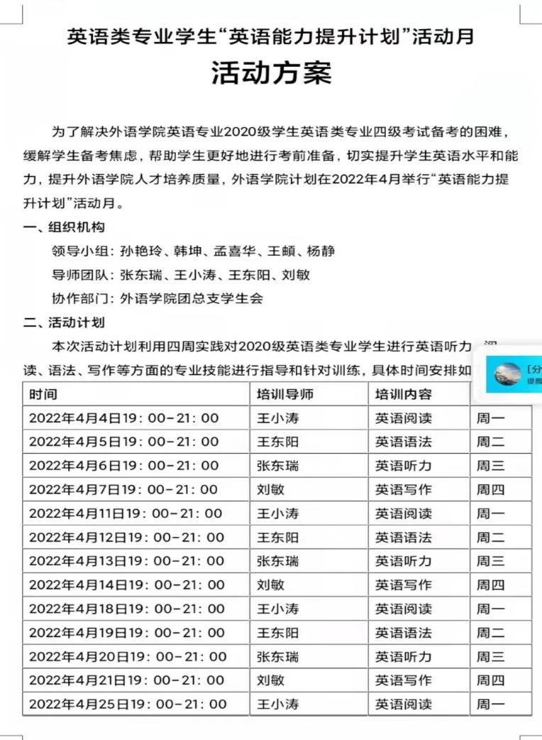 为贯彻落实《商丘师范学院“能力作风建设年”活动实施方案》精神,进一步将《天天精品视频免费观看能力作风建设年活动重点任务清单》落实落细,扎实为师生办实事解难题,切实解决2020级英语专业学生英语类专业四级考试备考困难,缓解学生备考焦虑,帮助学生更好的进行考前准备,切实提升学生英语水平和能力,提高天天精品视频免费观看人才培养质量。4月4日至25日,天天精品视频免费观看组建主讲导师专班,采取线上线下相结合的形式,连续举行了13场“英语能力提升计划”专项系列活动,分别对学生进行了英语听力、阅读、语法、写作等方面的专业技能进行指导和针对训练。