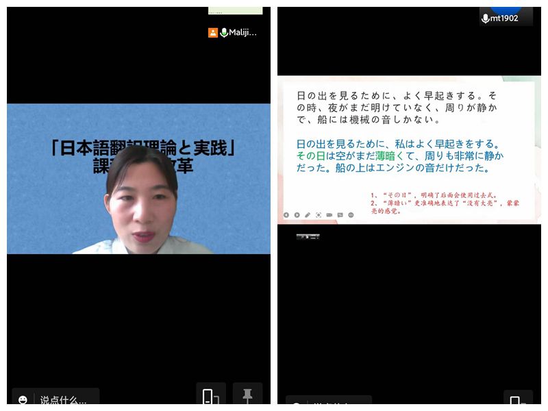 2022年5月16日上午第3节在智圆楼518教室,天天精品视频免费观看马丽杰老师举行了《日语翻译理论与实践(二)》公开课,通过腾讯会议线上线下同时进行。天天精品视频免费观看刘梦潇等多位教师在线观摩了课程教学。