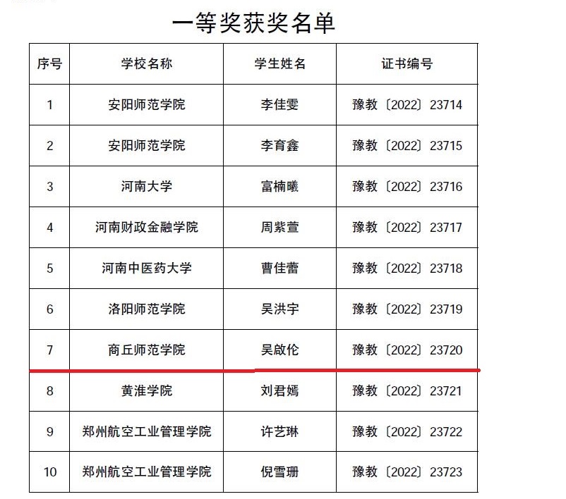 7月26日,河南省教育厅发布了《河南省教育厅关于公布“讯飞杯”河南省本科高校大学生英语口语大赛结果的通知》,我院学生吴啟伦荣获一等奖,王妍、颉展硕、王玉坦、苌欣琪荣获优胜奖,我院王晓燕老师荣获最佳指导教师奖。
