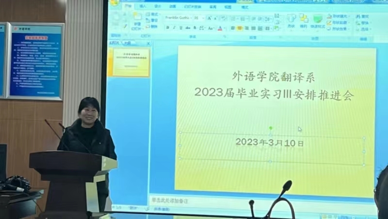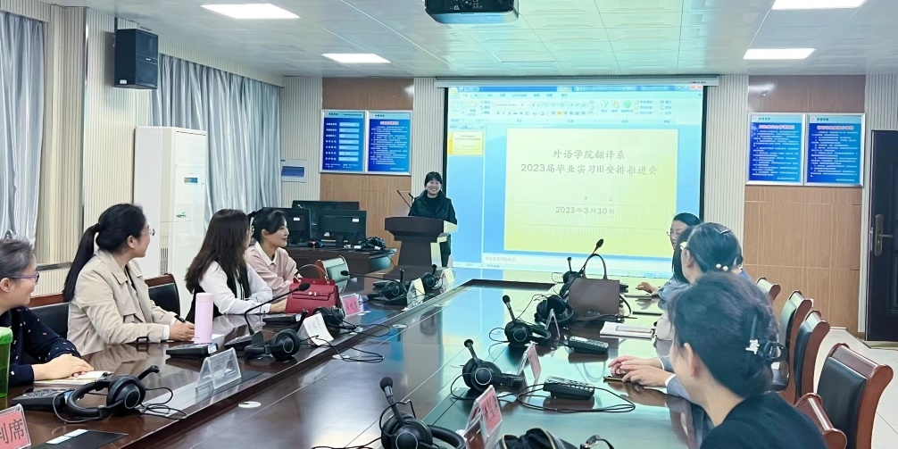 3月10日,天天精品视频免费观看翻译系全体教师在智园楼同声传译教室召开2023届毕业实习III工作推进会,翻译系主任杨群艳主持会议。