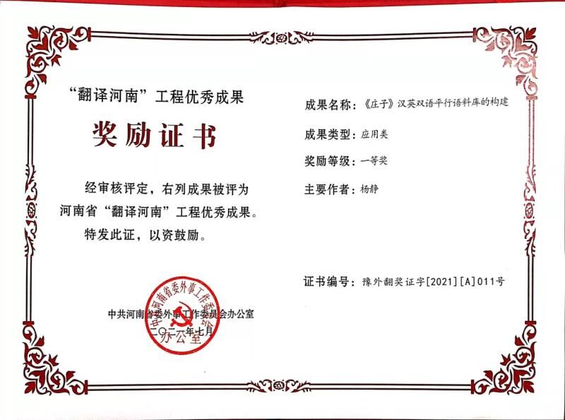 近期,我院副院长杨静博士的英文译著《庄子》由河南大学出版社正式出版发行。该译著为“中国思想文化术语多语种对外翻译标准化建设项目成果”,入选河南省人民政府外事办公室组织编译的《中华源河南故事》中外文系列丛书(英汉对照版),也是我校“河南省庄子文化外译与传播研究中心”的重要研究成果,该成果同时荣获了2021年度河南省“翻译河南”工程优秀成果奖“特等奖”。
