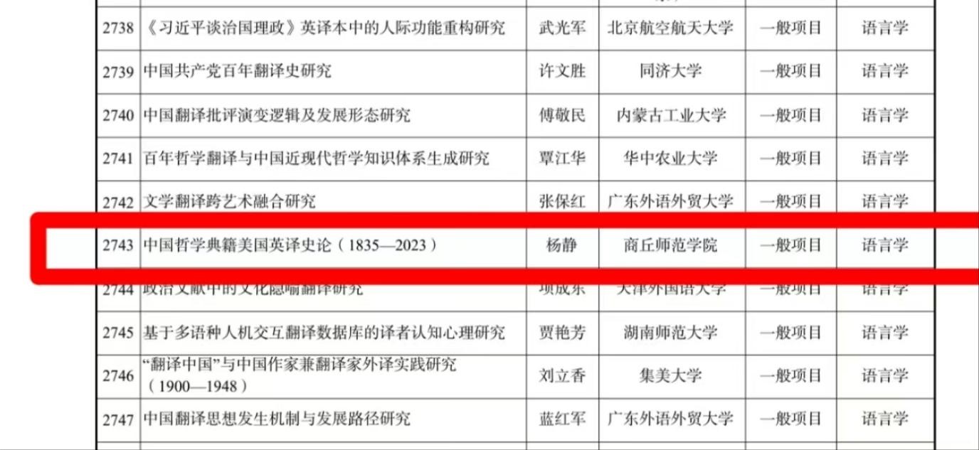 近日,全国哲学社会科学工作办公室公布了2023年度国家社科基金项目评审结果,我院副院长杨静教授主持的《中国哲学典籍美国英译史论(1835-2023)》获批立项。该项目的获批实现了天天精品视频免费观看建院(系)45年以来国家社科基金项目零的突破,也使学院科研工作迈上了新的台阶,显著提升了学院的科研层次和学术水平,对学院各项工作都起到了积极的示范引领作用。