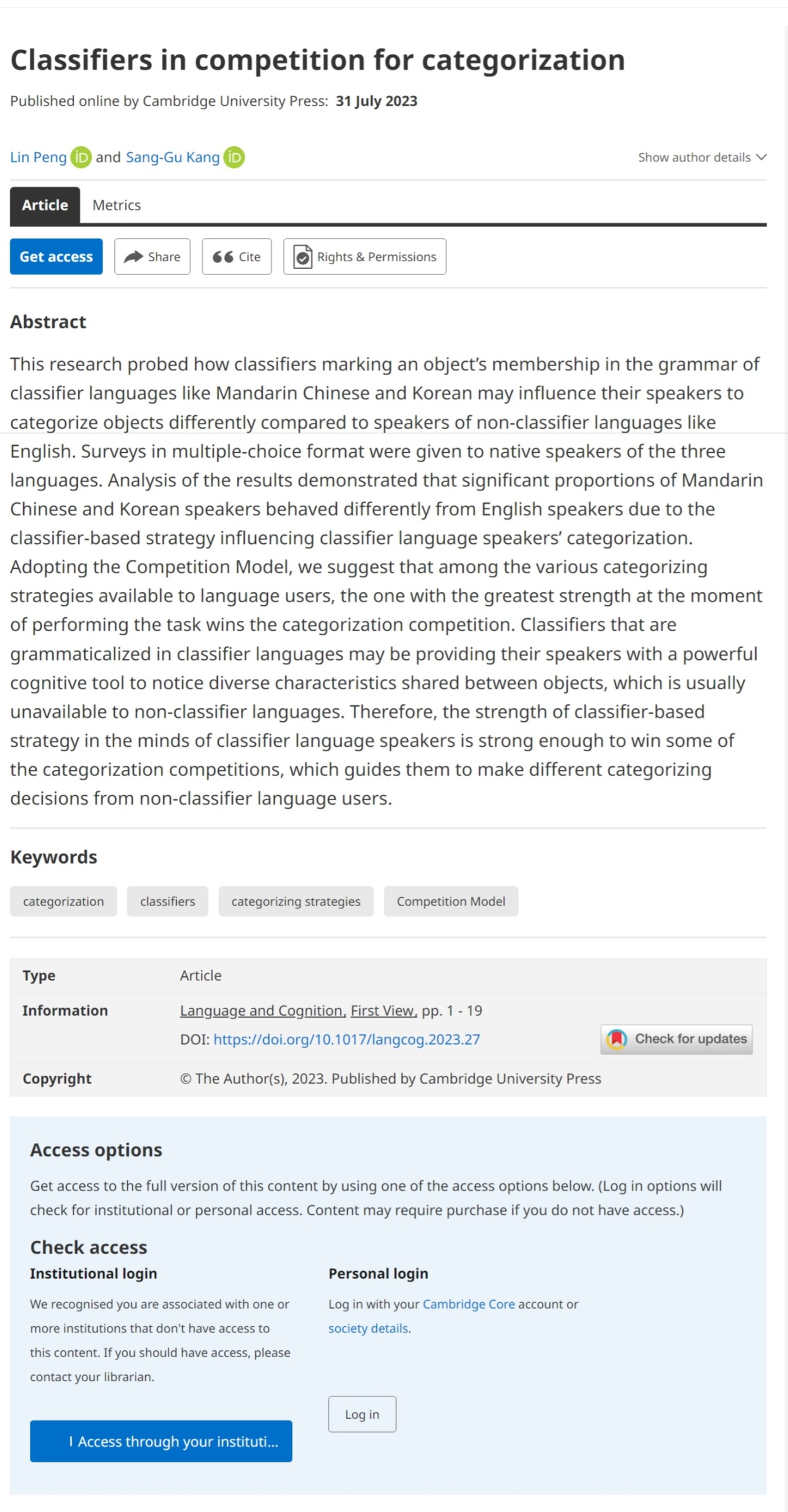 近日,天天精品视频免费观看彭琳博士以第一作者身份在国际期刊Language and Cognition上发表了题为“Classifiers in competition for categorization”的高水平学术论文。该论文基于前人研究成果,创新性地构建了中、英、韩三种语言的量词竞争模型,并采用实证研究方法,探讨了量词的结构、事物分类的形式以及量词对事物分类带来的影响等语言学因素对二语习得和母语使用者的影响。