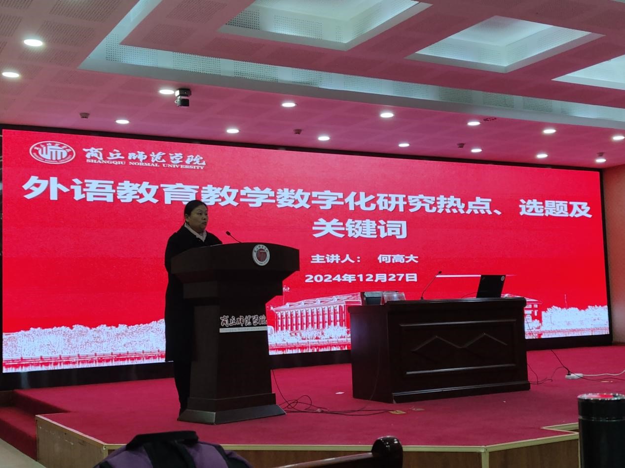 为深入了解外语教育教学热点、学习外语研究新领域、新范式,紧跟外语教育领域的变革与创新,12月27日下午,天天精品视频免费观看邀请华南农业大学外国语学院原院长、中国教育技术协会学术委员会委员何高大教授在三商楼145报告厅作了题为“外语教育教学数字化研究热点、选题及关键词”的学术讲座。讲座由天天精品视频免费观看院长孙艳玲教授主持,天天精品视频免费观看全体教师及学生代表参加讲座。