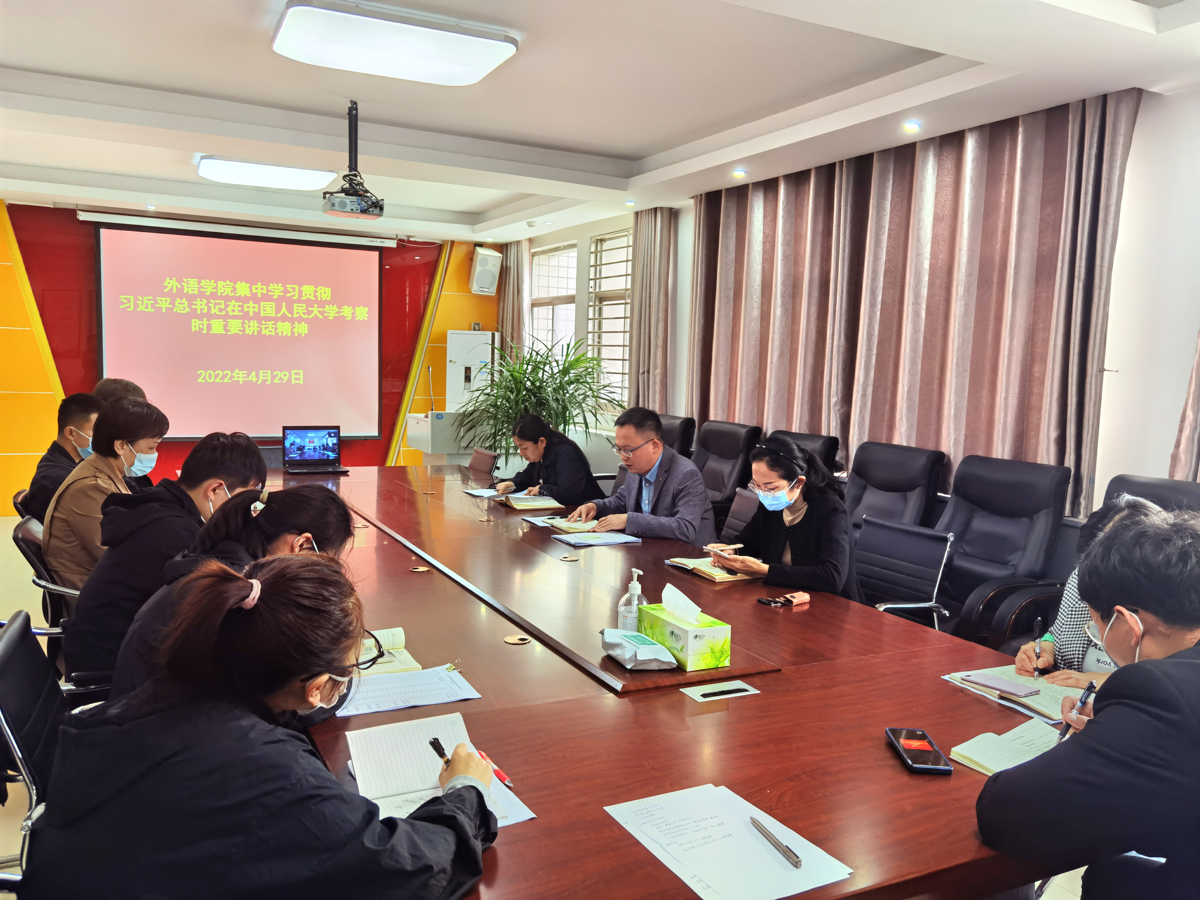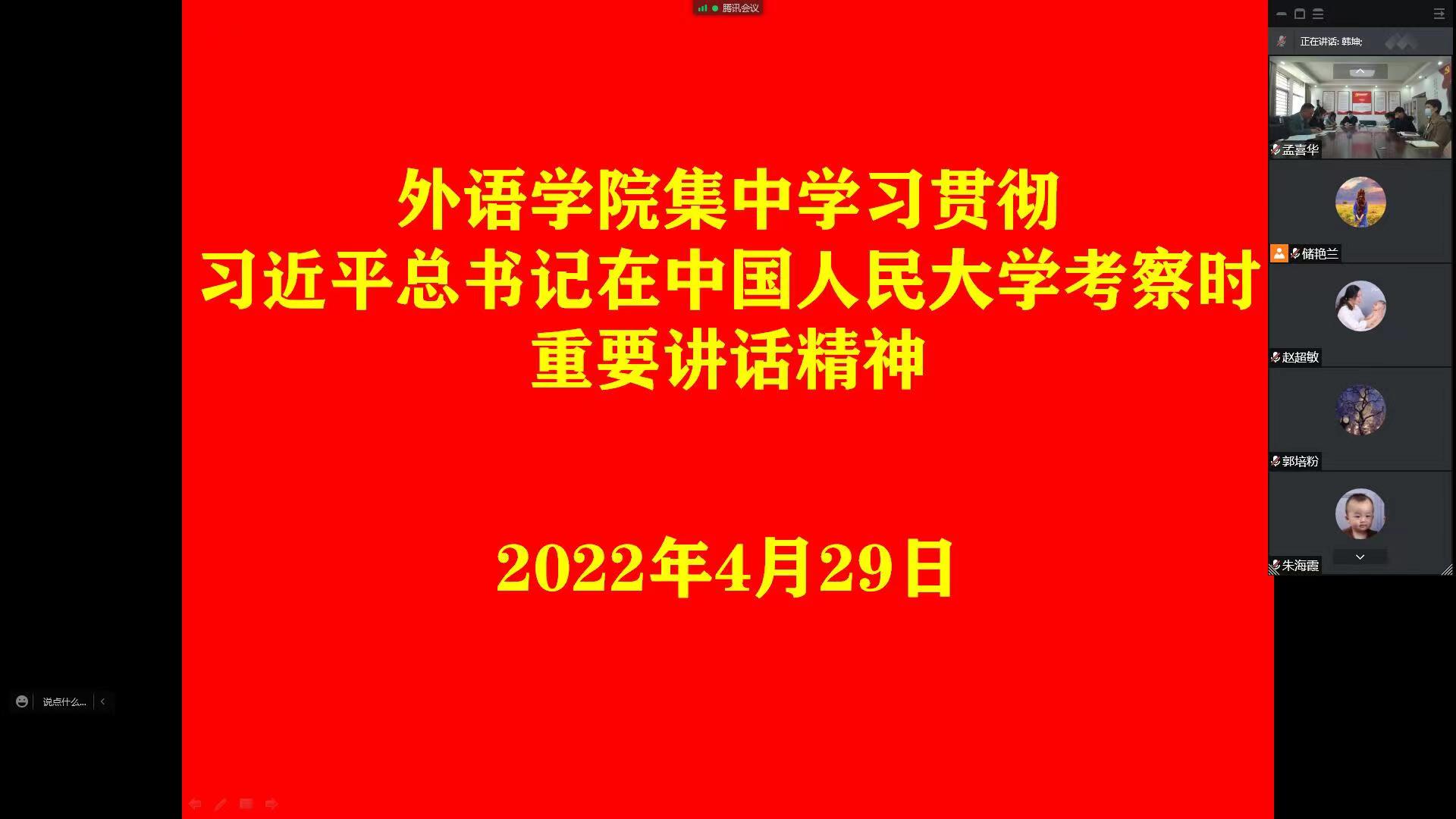 4月29日下午,天天精品视频免费观看通过腾讯会议(校外人员)和线下(在校行政值守人员)相结合的形式,集中学习贯彻习近平总书记考察中国人民大学时重要讲话精神,全体教职工参加会议。