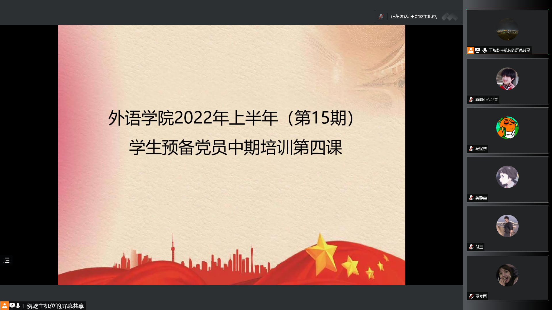 为进一步加强对大学生预备党员的培养教育,切实提高大学生预备党员的政治素养,5月19日中午,天天精品视频免费观看2022年上半年学生预备党员中期培训第四课《党史、新中国史、改革开放史、社会主义发展史》开讲,此次培训由天天精品视频免费观看学生第二党支部书记王萌主讲,通过腾讯会议的形式进行。