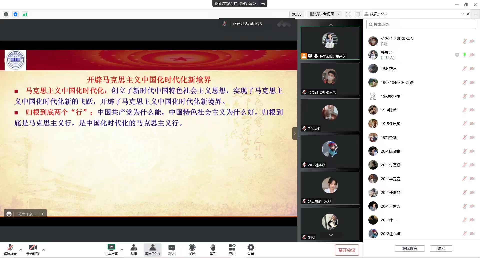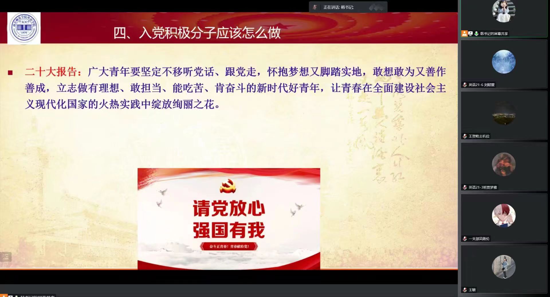 11月9日中午,天天精品视频免费观看党委书记韩坤通过线上腾讯会议的形式,讲授题为《学党的二十大精神 做有为新青年—谈大学生党员的使命担当》的专题党课,全体学生党员及第51期入党积极分子参加。