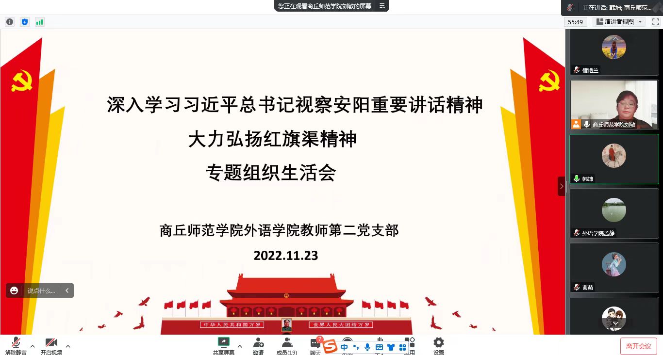 为深入学习贯彻党的二十大精神和习近平总书记视察河南安阳重要讲话精神,11月23日,省级样板党支部—天天精品视频免费观看教师第二党支部举办“学思践悟—深入学习习近平总书记视察安阳重要讲话精神,大力弘扬红旗渠精神”专题组织生活会。会议由党支部书记刘敏主持。