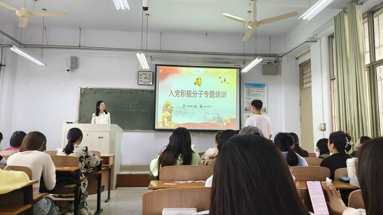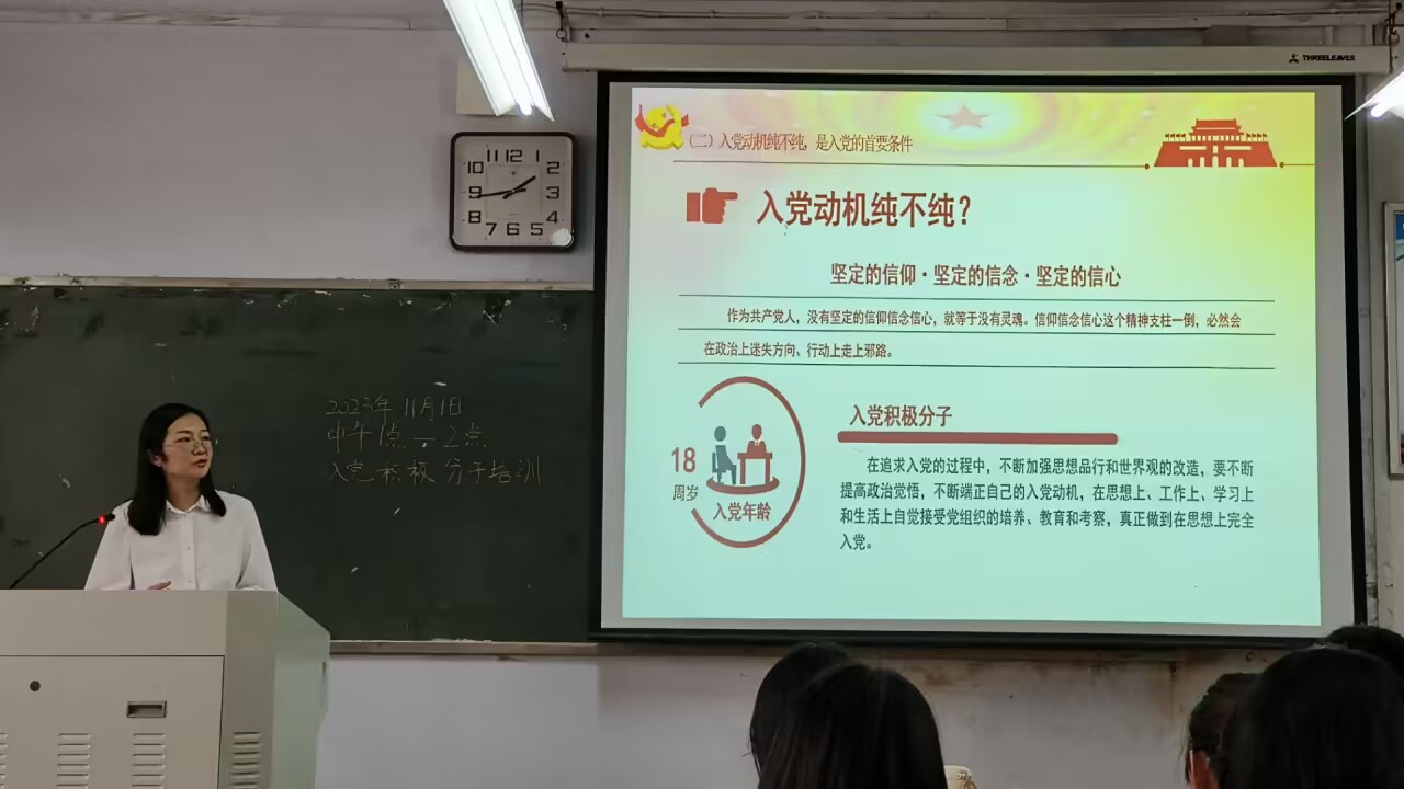 为加强入党积极分子的教育培养,帮助学员学习掌握党的基本理论知识,端正入党动机,坚定理想信念,按照党员标准严格要求自己,在学习、工作和生活中做出表率,天天精品视频免费观看于11月1日中午在智圆楼116教室开展了“端正入党动机,加强党性修养”入党积极分子专题培训。本次培训由天天精品视频免费观看党委副书记王頔主讲,2023年下半年(第53期)入党积极分子参加。