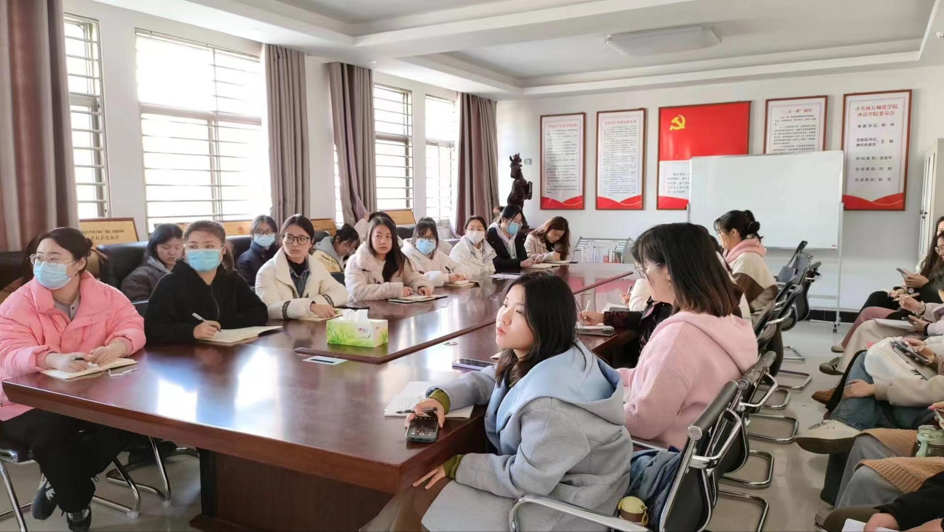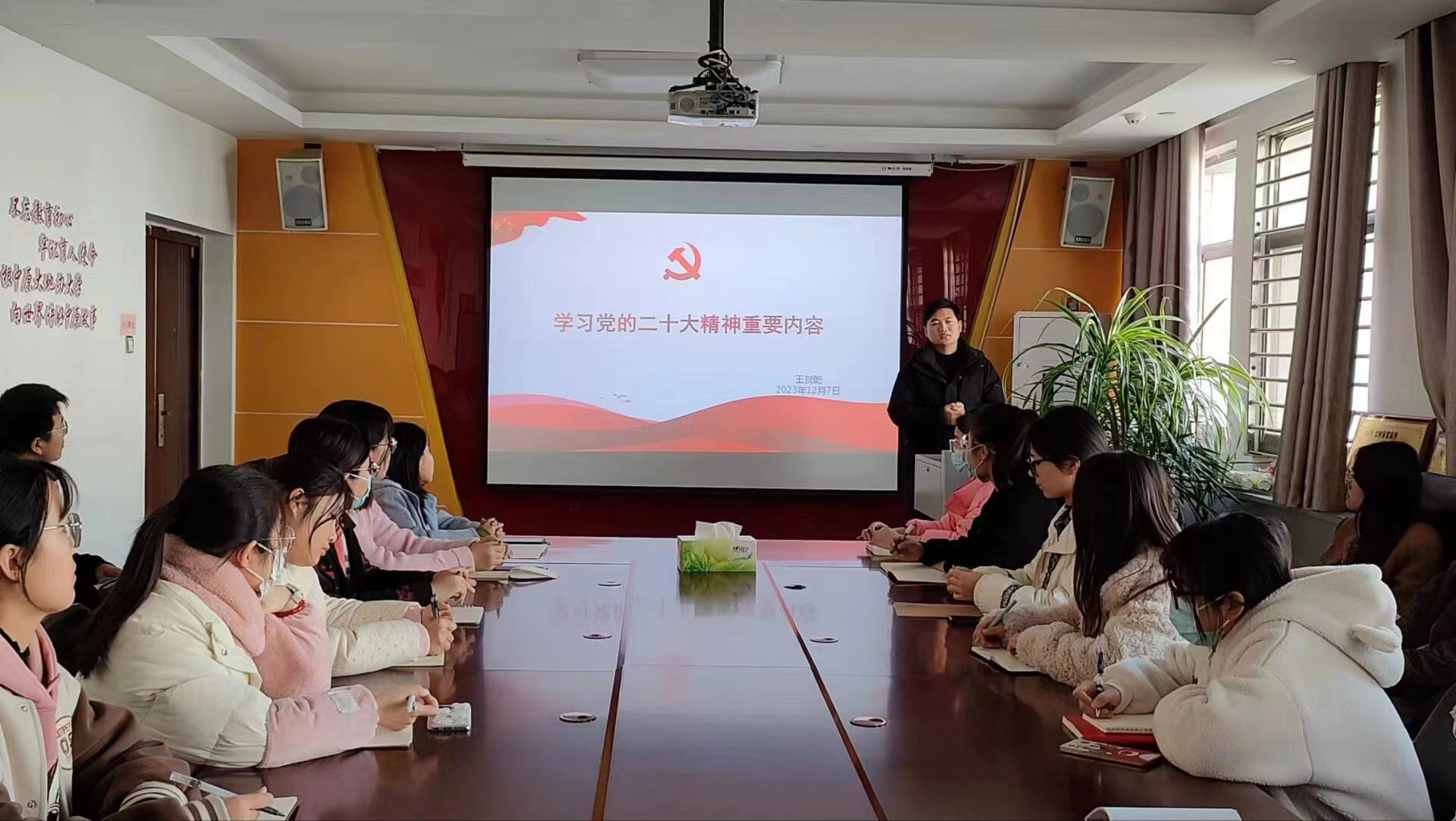 首先,王贺乾介绍了本次培训的主要内容和具体培训安排,接着他从党的二十大的主题、“三个务必”、党的自我革命等方面进行讲述,要求大家认真学习贯彻习近平新时代中国特色社会主义思想和党的二十大精神,学好理论知识,提升党性修养,时刻以共产党党员的标准严格要求自己,不断增强守初心、担使命的思想自觉和行动自觉,争做堪当民族复兴重任的时代新人。