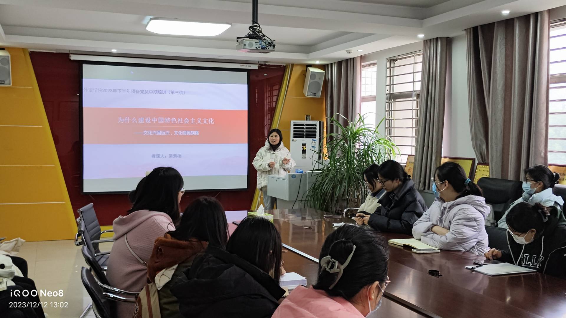 为了增强文化自信,弘扬中国特色社会主义文化,天天精品视频免费观看于12月12日中午在应天楼214会议室开展了以“为什么建设中国特色社会主义文化”为主题的2023年下半年(第18期)预备党员中期培训(第三讲)。本次培训由学生第四党支部书记常素枝主讲,天天精品视频免费观看全体应参训预备党员参加。