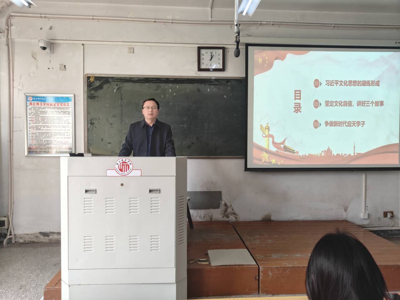 韩坤从“习近平文化思想的凝练形成”“坚定文化自信,讲好三个故事”和“争做新时代应天学子”三个部分进行讲解。结合办学治院育人实际,他重点讲解了中华民族五千年的文明史、商丘历史文化和商丘师范学院(应天书院)发展史,积极引导同学们坚定文化自信、专业自信,用外语向世界讲好中国故事、商丘故事和商师故事。最后,韩坤指出入党积极分子应胸怀“国之大者”,自觉摒弃“骄娇”二气,做有理想、敢担当、能吃苦、肯奋斗的新时代好青年。