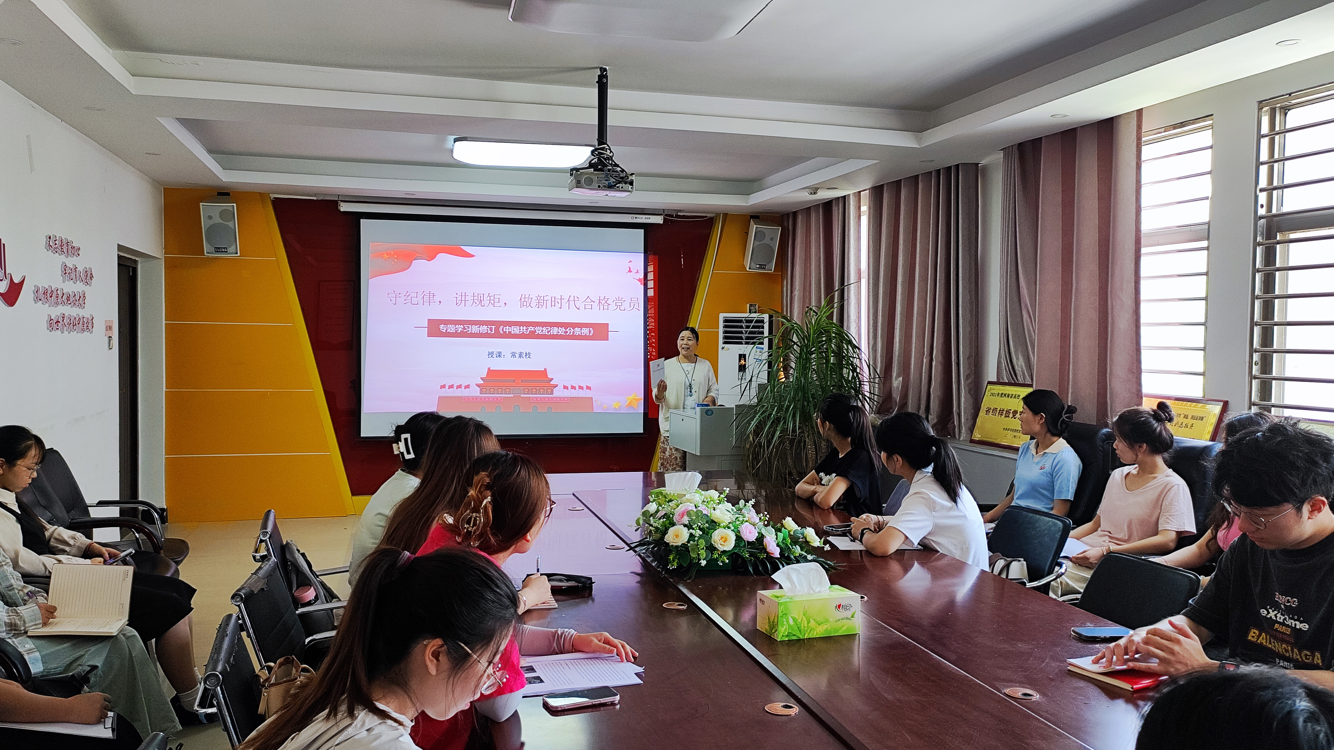为切实提高学生党员的自律意识,5月23日中午,天天精品视频免费观看学生第四党支部书记常素枝在应天楼214会议室讲授了《守纪律,讲规矩,做新时代合格党员》专题党课,并组织预备党员学习了新修订的《中国共产党纪律处分条例》。
