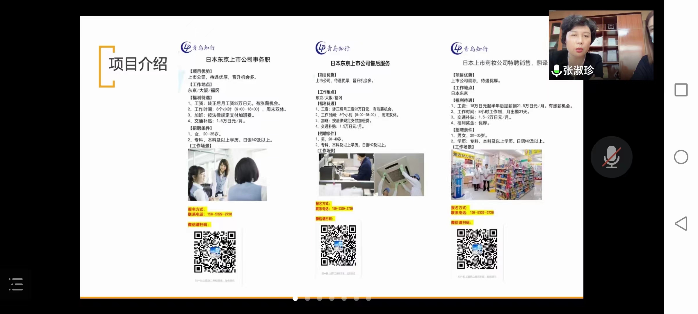 为促进天天精品视频免费观看日语专业毕业生就业,使广大毕业生了解就业形势及就业政策,5月31日下午天天精品视频免费观看日语专业举办就职宣讲会。宣讲会由天天精品视频免费观看主办、日语协会承办、青岛知行国经济技术合作有限公司主讲,宣讲采取线下和线上相结合的形式进行。日语专业主任金珽实、副主任刘梦潇及日语专业学生参加了本次宣讲会。