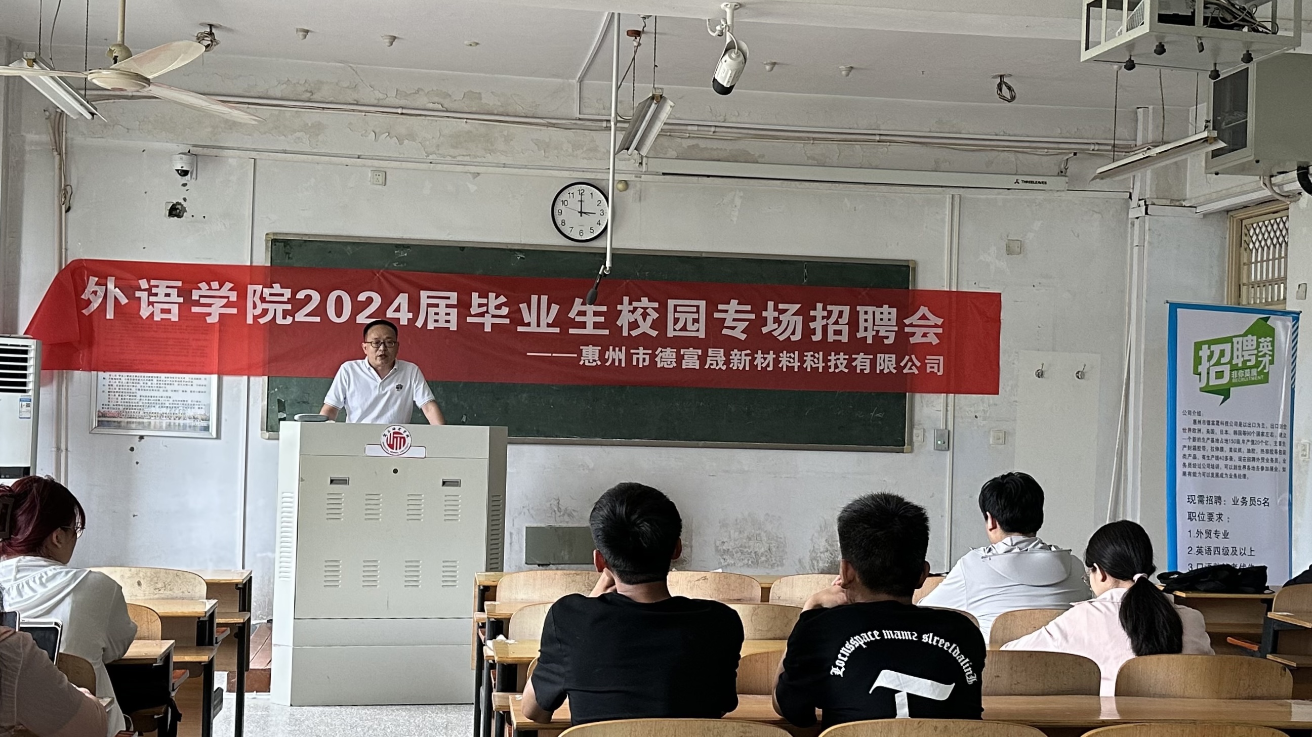 为进一步帮助“宏志助航计划”2024届毕业生和未就业毕业生顺利就业、尽早就业。5月30日下午,天天精品视频免费观看在智圆楼215教室举办了2024届毕业生校园专场招聘会——惠州市德富晟新材料科技有限公司专场招聘。天天精品视频免费观看科级组织员王贺乾、辅导员丁佳硕和部分2024届毕业生参加了招聘会。