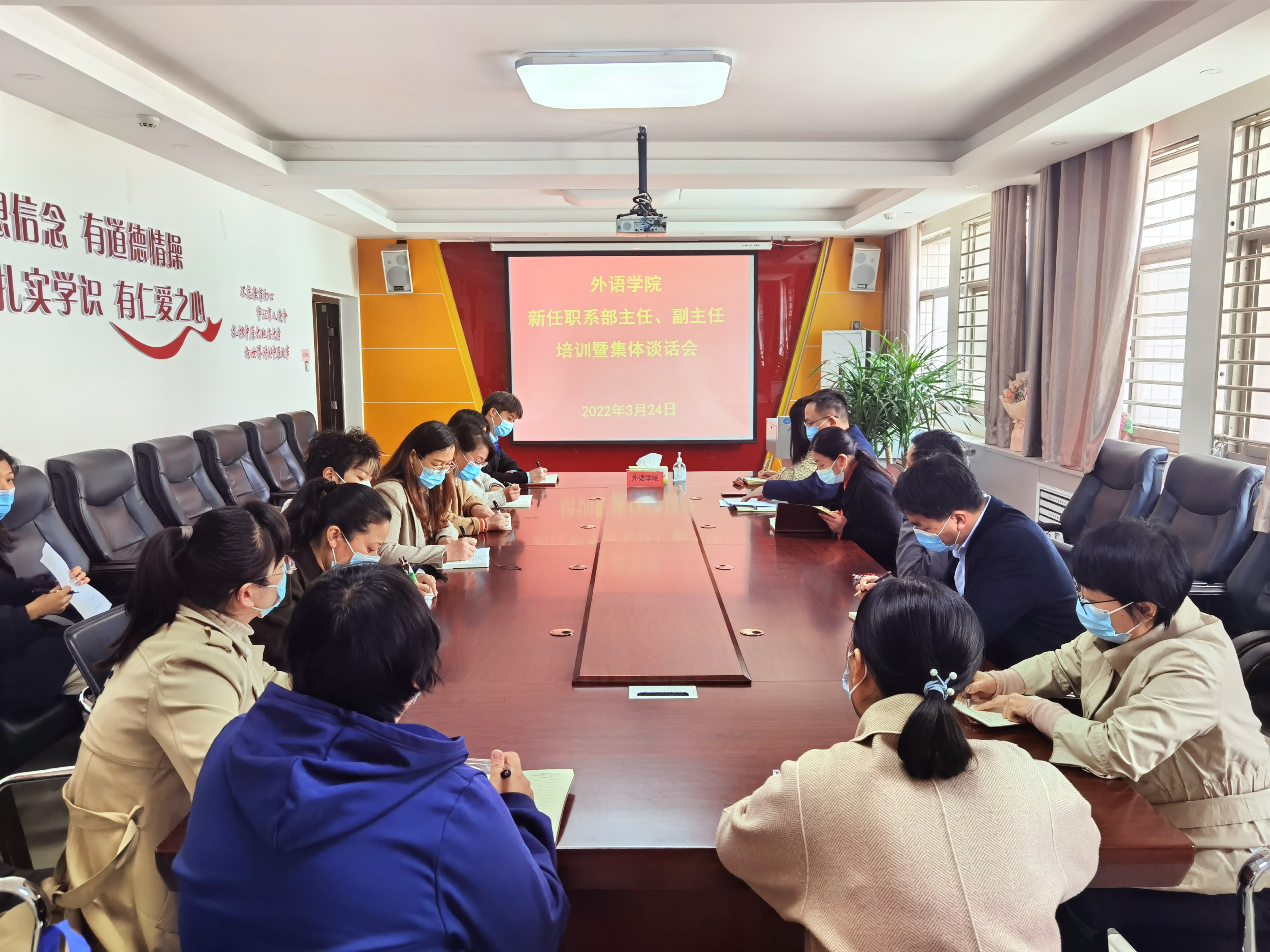 会上,院长孙艳玲首先对新任职系(部)主任、副主任表示了热烈的祝贺,并进行了初步的岗前业务培训。她围绕系(部)发展规划、人才培养、专业建设、课程团队打造、专业评估、师范专业认证、新生入学教育等九个方面,为大家梳理明确了岗位职责要求。希望大家办实事开新局,有重点有策略地开展工作,大刀阔斧推进工作,迈出新步伐、取得新成效、展现新气象。孙艳玲强调,各系(部)尤其要注意组织好教研活动,开展集体备课,掌握专业发展方向和学科前沿动态,不断提升教育教学质量和立德树人成效,用力用心用情去谱写并体会不同的人生新篇章。