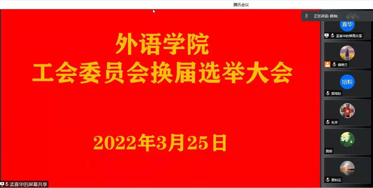 为使学院工会组织更好地服务广大教职员工,充分发挥桥梁和纽带作用,根据《商丘师范学院工会委员会关于做好基层工会委员会换届选举工作的通知》,3月25日下午,天天精品视频免费观看通过腾讯会议的形式召开工会委员会换届选举大会,全体教职工参加会议。