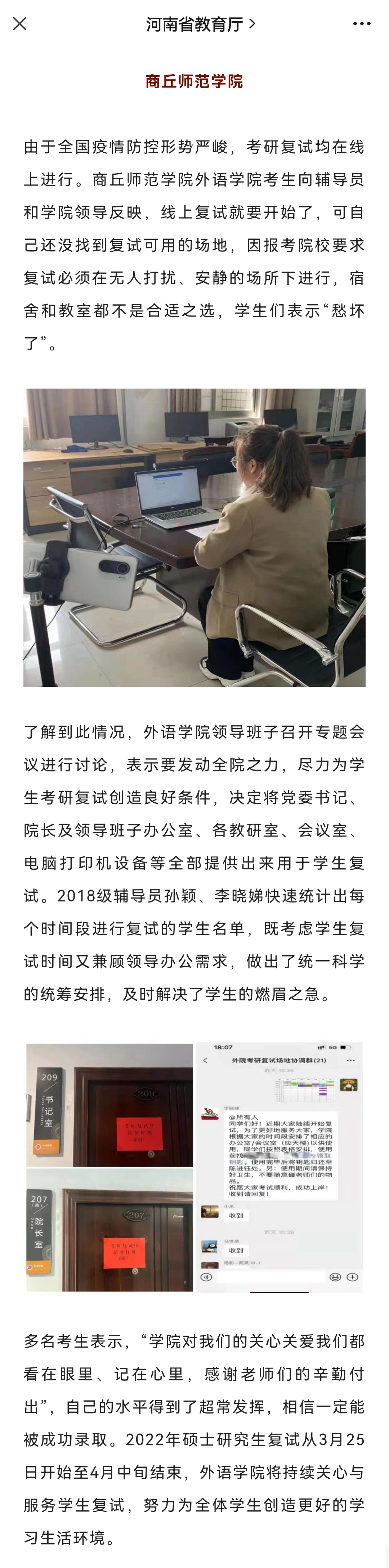 受疫情影响,多所高校明确考研复试将以线上为主。在校园封闭管理的情况下,为帮助同学们顺利应试,河南部分高校高度重视,密切关注学生考研复试情况,召开研究生复试指导专题会、安排线上复试会议室......尽最大努力为学生营造良好的复试环境,确保复试顺利进行。