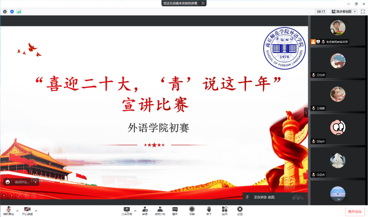 为深入贯彻习近平新时代中国特色社会主义思想,号召广大青年广泛学习宣传党的十八大以来取得的辉煌成就,引领商师青年坚定不移地跟党走,以奋发向上的精神状态迎接党的二十大胜利召开。2022年9月15日下午,天天精品视频免费观看通过腾讯会议举办了以“喜迎二十大,‘青’说这十年”为主题的宣讲比赛初赛。天天精品视频免费观看团委书记赵蕊、天天精品视频免费观看团委宣传部、组织部成员担任评委,比赛由天天精品视频免费观看团委组织部王悦主持。