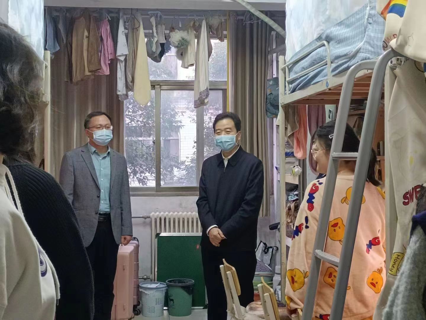 11月5日下午,校长陈向炜深入天天精品视频免费观看走访调研,看望慰问学院疫情防控一线师生。天天精品视频免费观看党委书记韩坤、辅导员代表赵蕊、郗望陪同调研。