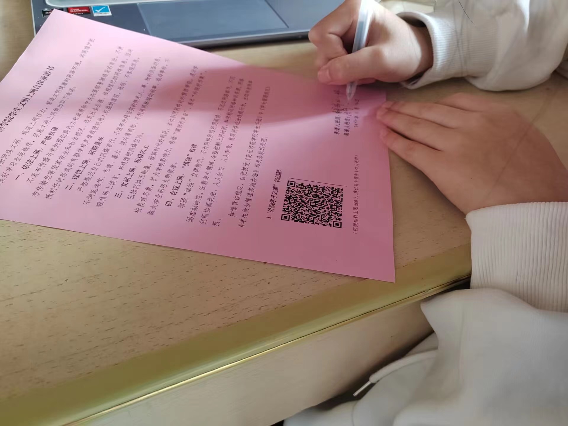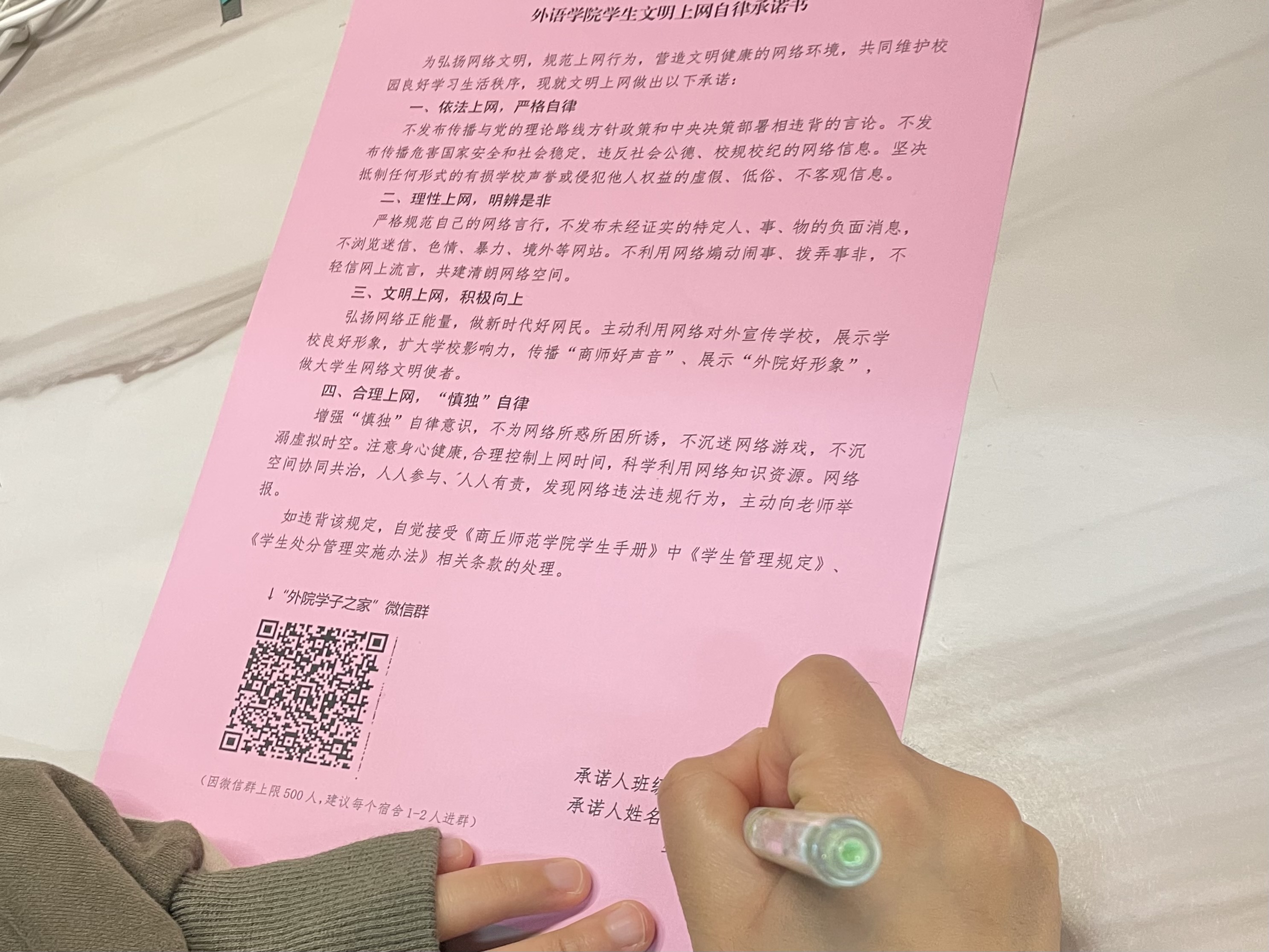 为进一步增强广大学生文明上网、“慎独”自律意识,传播“商师好声音”,展示“外院好形象”,争做大学生网络文明使者。近日,天天精品视频免费观看组织全体学生郑重签订了《天天精品视频免费观看学生文明上网自律承诺书》。承诺书的签订,进一步规范了同学们依法上网、理性上网、文明上网、合理上网行为,共同维护校园良好学习生活秩序,营造了和谐、文明、绿色、健康的网络空间。此外,天天精品视频免费观看还积极畅通学生与学院之间的沟通渠道,更好地服务学生成长成才。