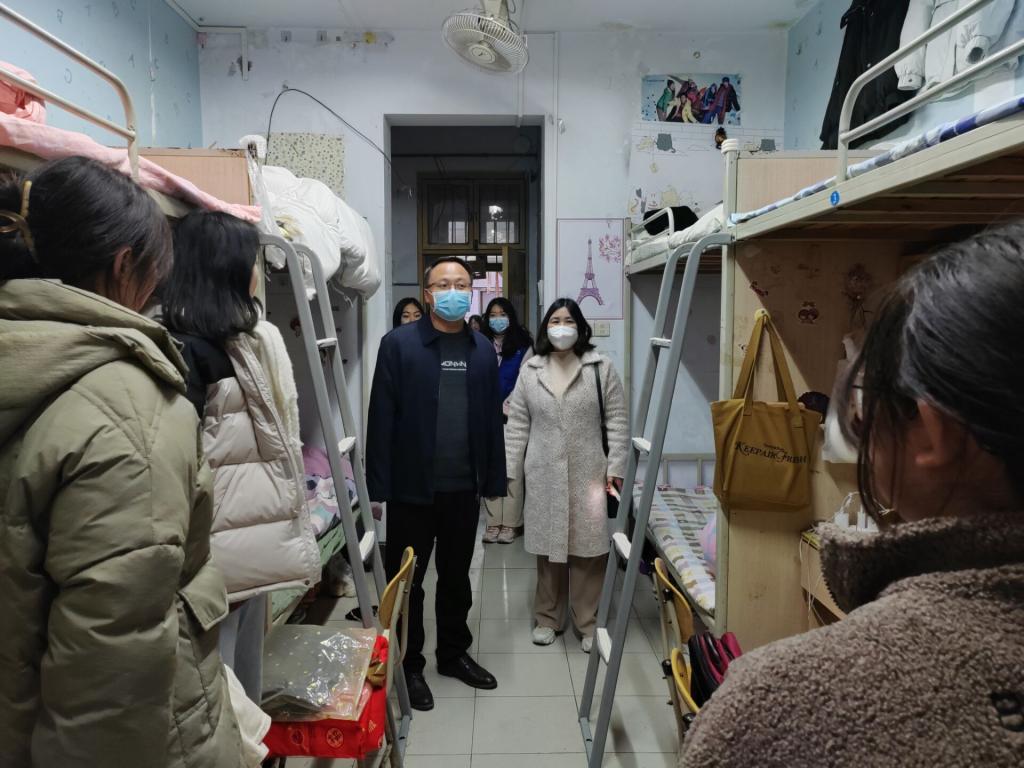 接着来到学生宿舍走访看望返校的同学们,并进行亲切的交谈,了解学生的学习和生活状况,排查安全隐患,提醒同学们注意用电防火等宿舍安全问题;叮嘱同学们当下要保持良好个人习惯,做好自己的健康第一责任人;同时勉励大家在新学期做好规划、认真学习、乐观生活,以饱满的热情迎接新的学期。党委书记韩坤还特意走访了毕业生宿舍,询问了他们的求职情况以及今后目标,提醒他们要好好准备毕业论文,充分利用好最后一个学期。