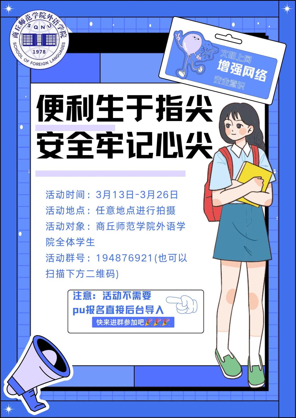 网络是亿万网民共同的精神家园,为使广大青年学生更加深刻了解网络安全和依法上网的重要性,做到文明上网,理性发言,天天精品视频免费观看于3月13日至26日面向全院学生开展了“便利生于指尖,安全牢记心间”文明上网短视频征集活动。