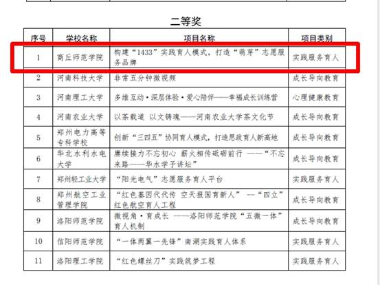 近日,河南省教育厅下发《关于公布2022年普通高等学校学生工作优秀成果项目获奖名单的通知》(教学〔2023〕86号),经各高校推荐,省教育厅组织专家评审,通过网络评审、专家评议、现场展示、专家终审和网上公示等环节,天天精品视频免费观看《构建“1433”实践育人模式,打造“萌芽”志愿服务品牌》项目在全省110项学生工作优秀成果中脱颖而出,荣获二等奖。