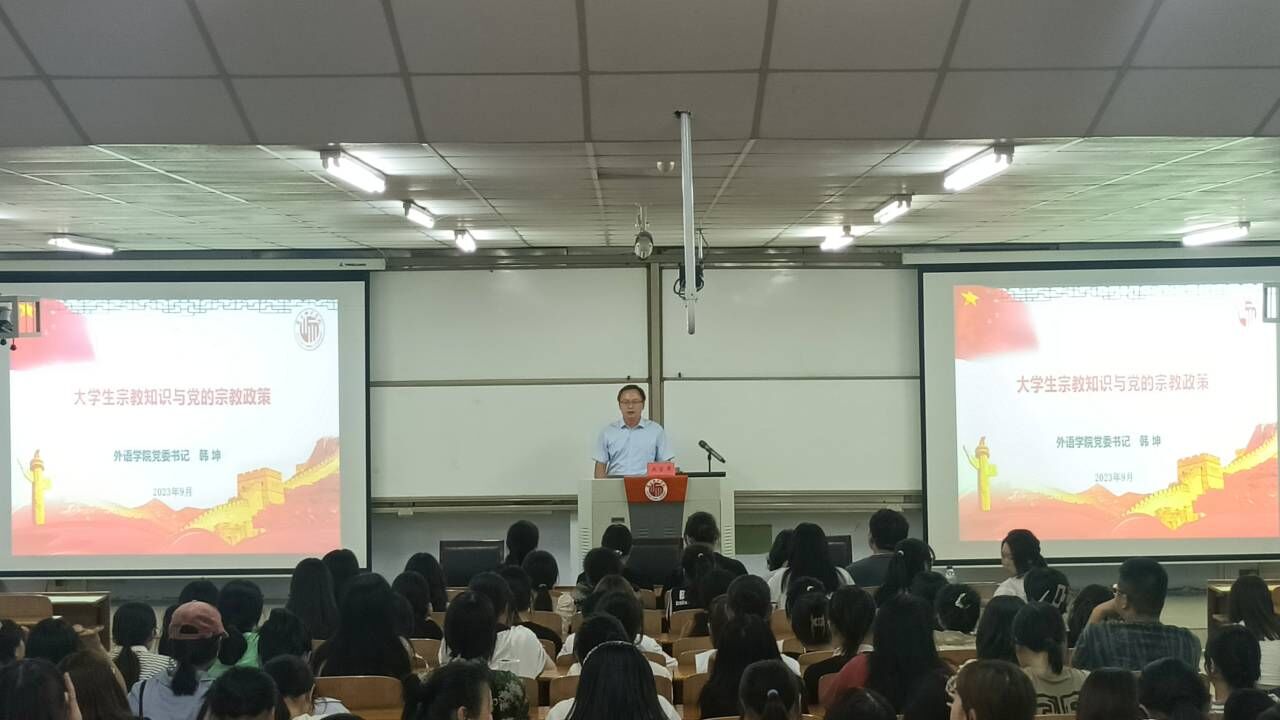 为加强2023级新生的宗教政策法规专题教育,帮助学生树立马克思主义宗教观,9月15日晚,天天精品视频免费观看党委书记韩坤于智圆楼208教室为2023级全体新生讲授“大学生宗教知识与党的宗教政策”专题思政课。
