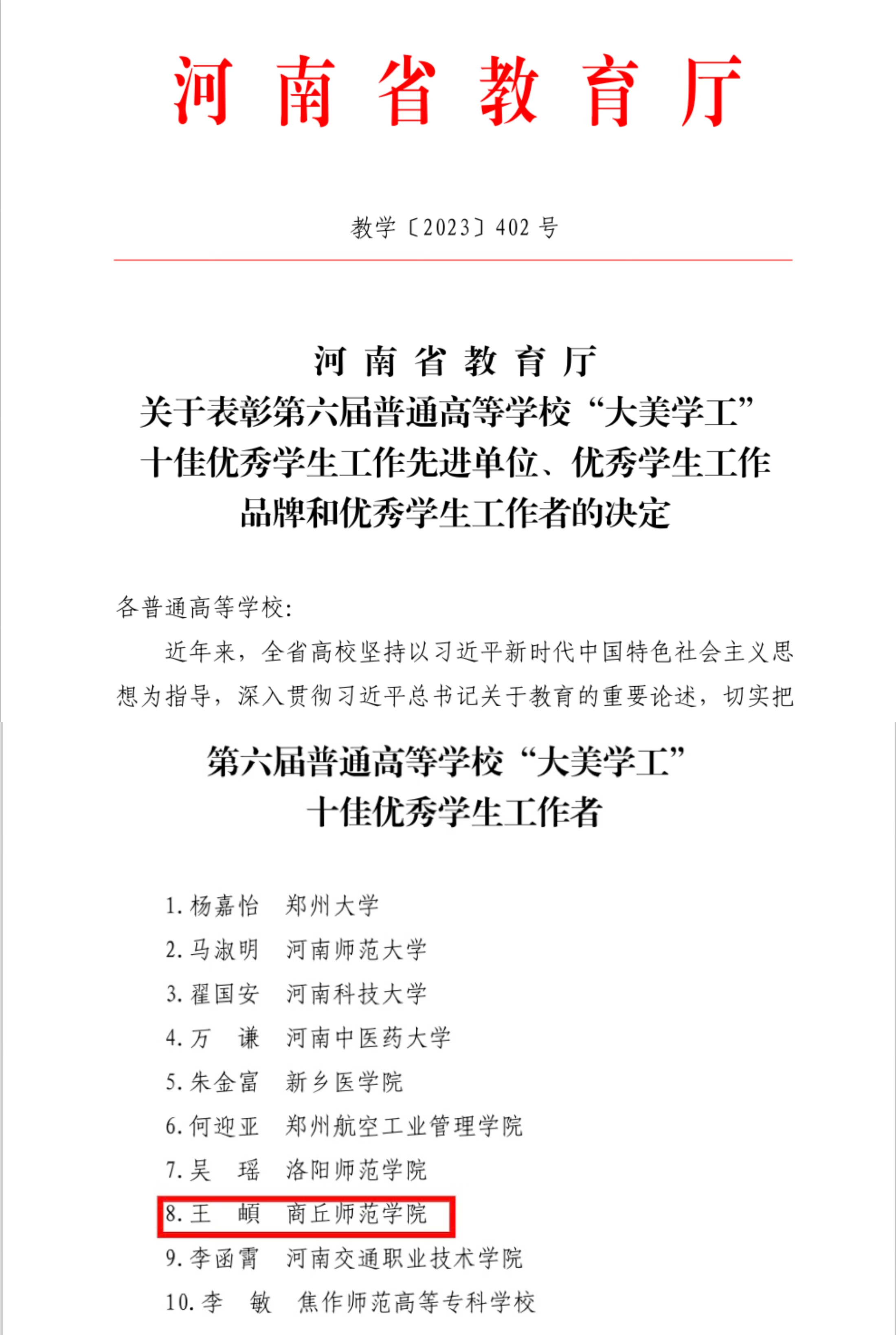 近日,河南省教育厅公布《关于表彰第六届普通高等学校“大美学工”十佳优秀学生工作先进单位、优秀学生工作品牌和优秀学生工作者的决定》(教学[2023]402号),经全省各高校选拔推荐、专家评审和网上公示,我院党委副书记王頔荣获全省“十佳优秀学生工作者”称号。