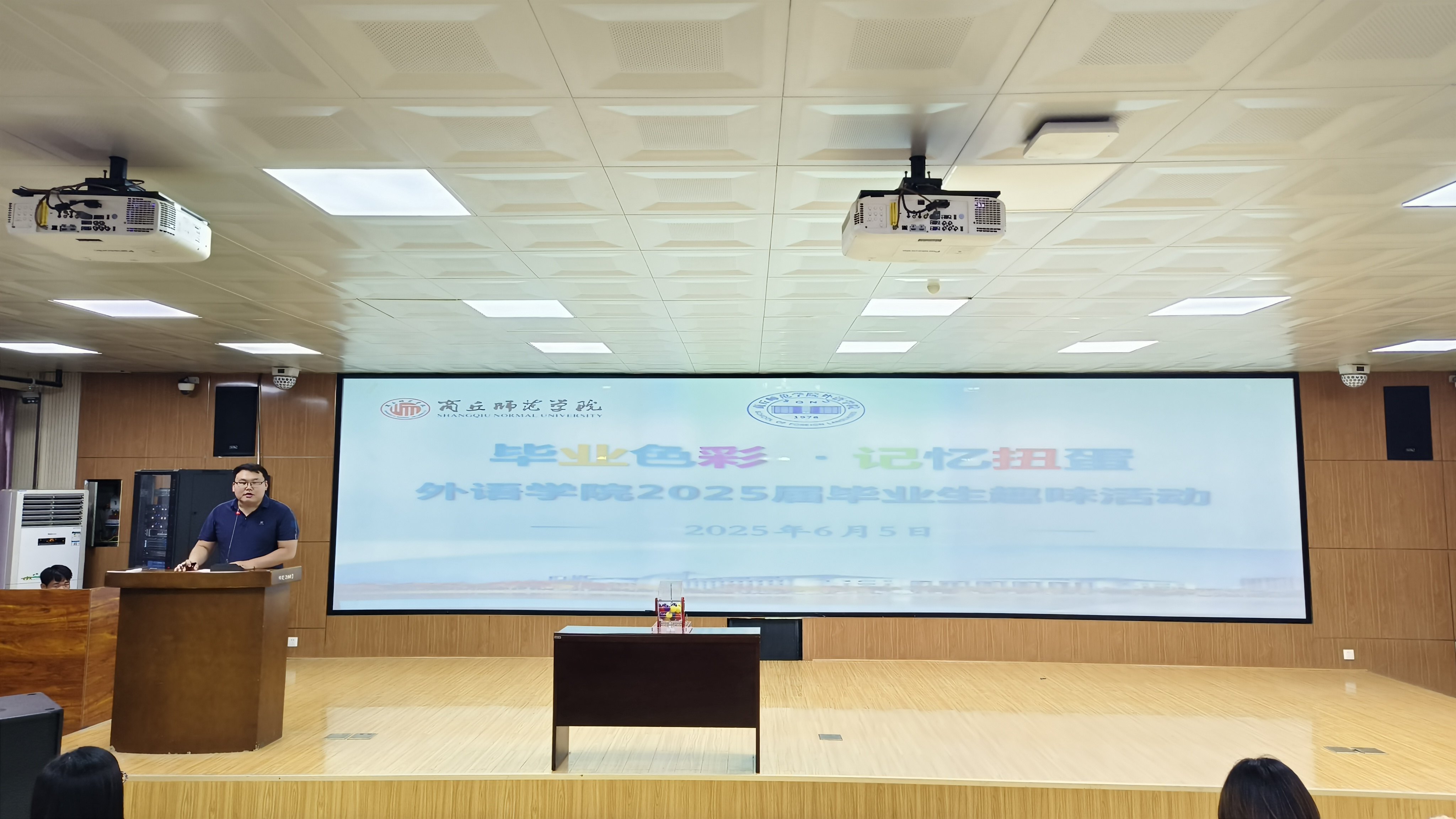 孙艳玲为毕业生做“最后一堂思政课”教育,她对2025届毕业生取得的成绩给予了高度赞扬,并鼓励大家永远不要停止前进的步伐,要勇于面对人生挑战,用专业能力传递中国好声音,服务国家建设,用开放心态拥抱多元文化,讲好中国故事,把人生目标与中华民族伟大复兴紧密结合起来,用乐观和坚强化解生活中的困难,用爱心和包容赢取未来。她强调,母校永远是大家的精神家园,要爱校、护校、荣校,自觉传承商师精神,争做“有理想、敢担当、能吃苦、肯奋斗”的新时代好青年,用奋斗去博出人生精彩!并祝大家前程似锦、未来可期!