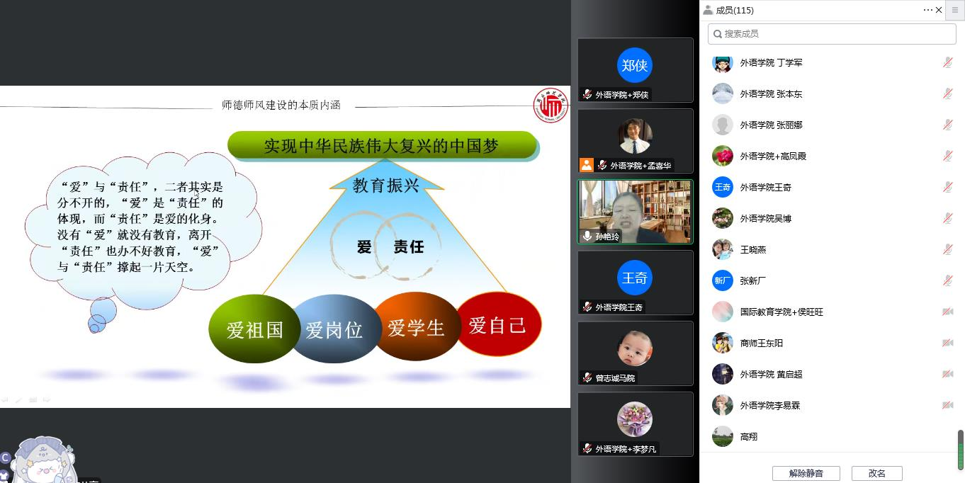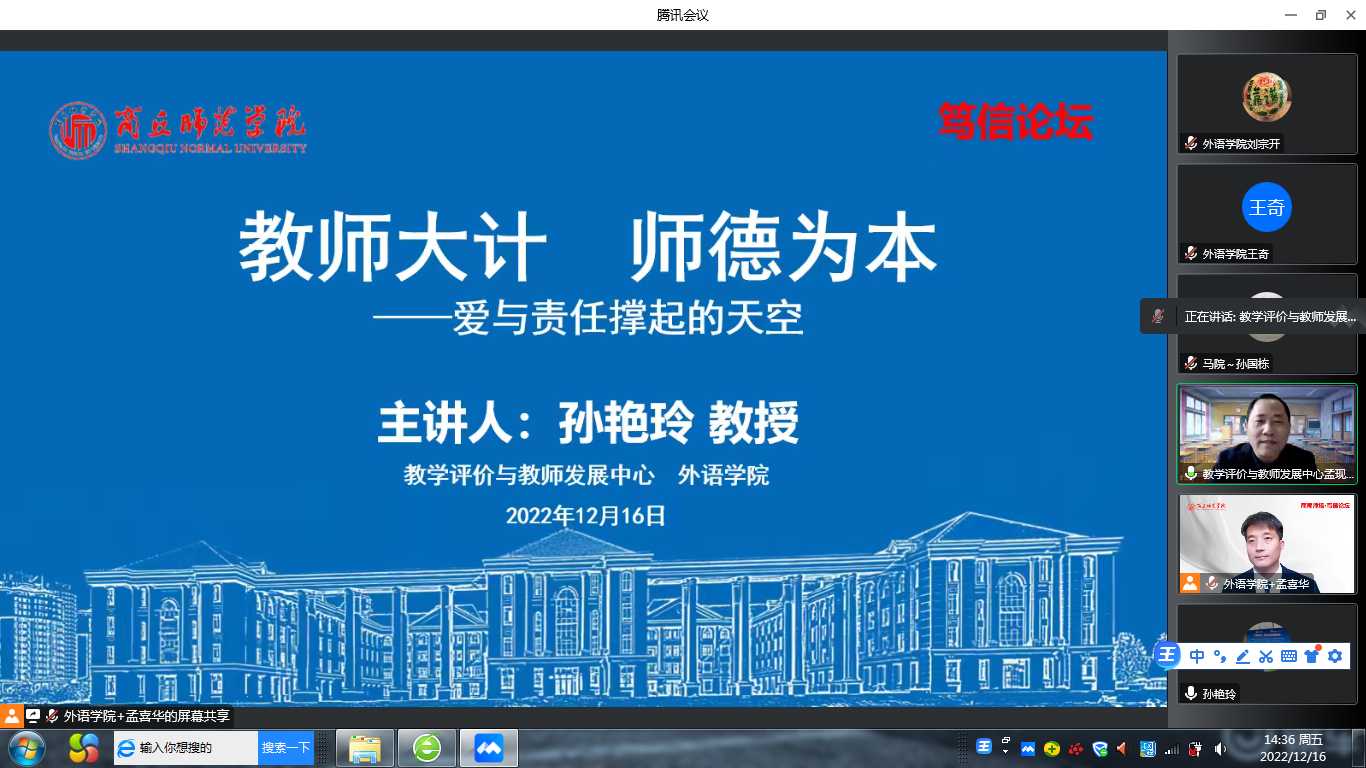 12月16日下午,由教学评价与教师发展中心主办、天天精品视频免费观看承办的“笃信论坛”通过腾讯会议进行线上直播。天天精品视频免费观看院长孙艳玲教授作题为《教师大计 师德为本—爱与责任撑起的天空》专题讲座,100多位来自校内外的教师参。讲座由天天精品视频免费观看副院长孟喜华主持。