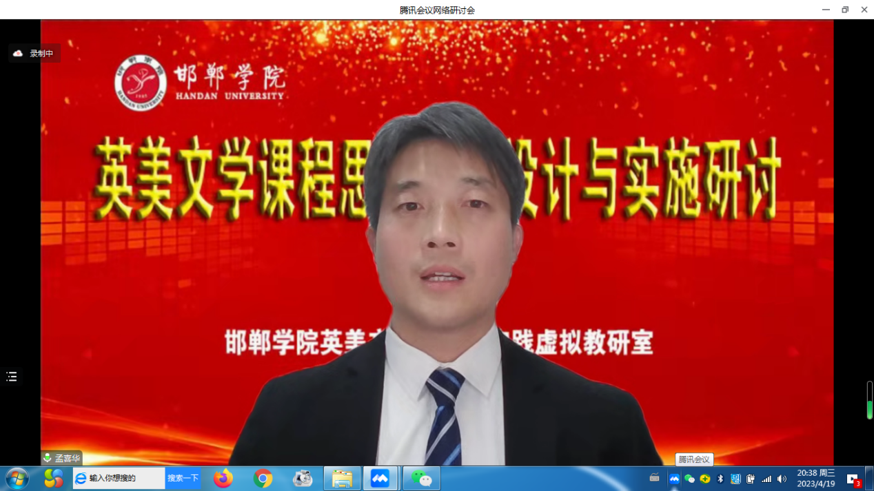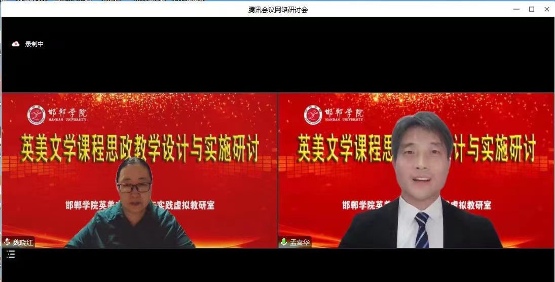 2023年4月19日晚,应邯郸学院天天精品视频免费观看院长魏晓红教授邀请,我院副院长孟喜华为该校“英美文学及选读教学与实践虚拟教研室”做了题为《<英美文学选读>课程思政教学设计与实施》的讲座。虚拟教研室联盟成员单位中,来自广西、新疆、宁夏、内蒙古、辽宁、山西、河南、河北等中西部省份的九所高校英美文学专任教师,线上参加了本次讲座。