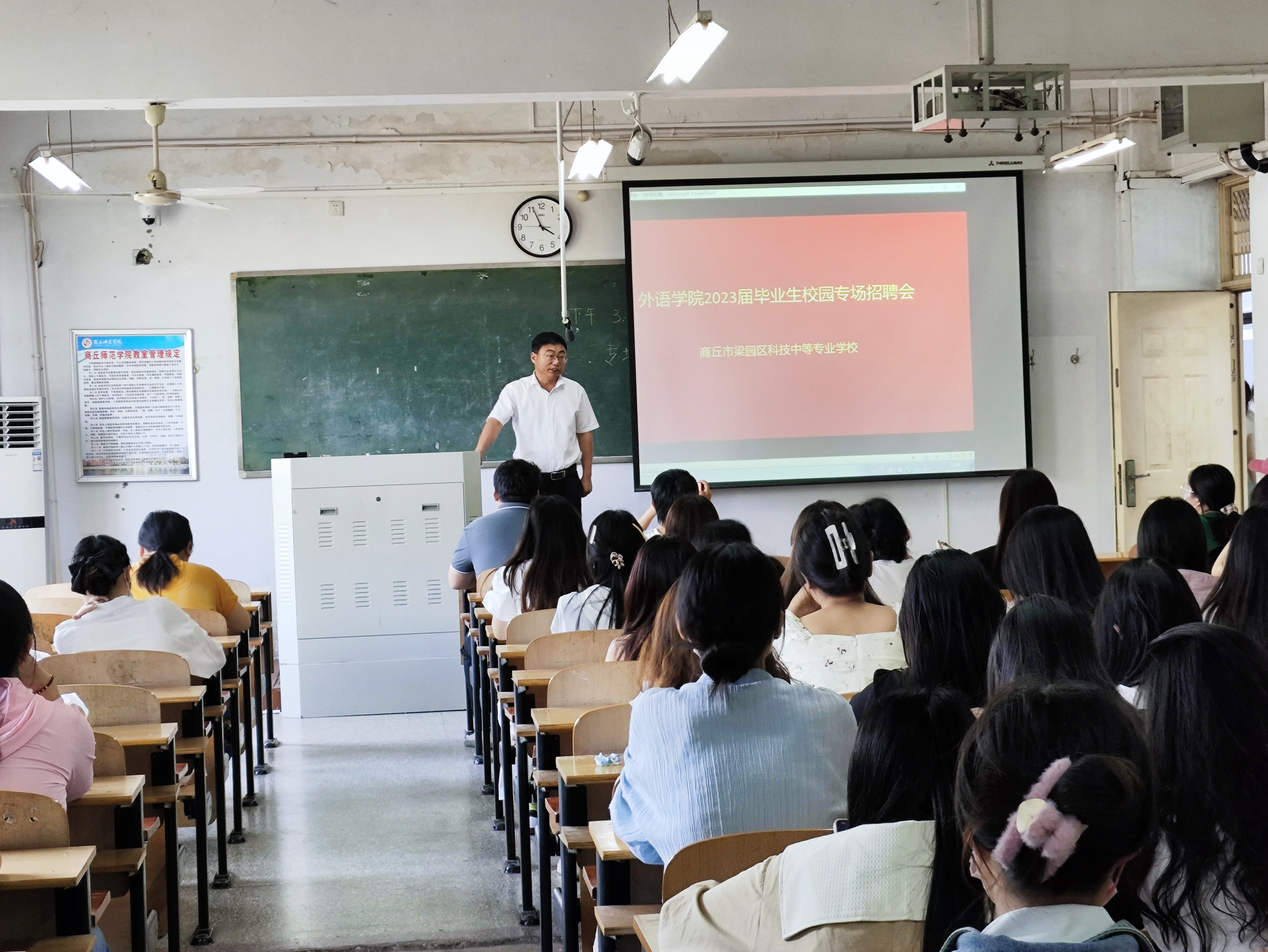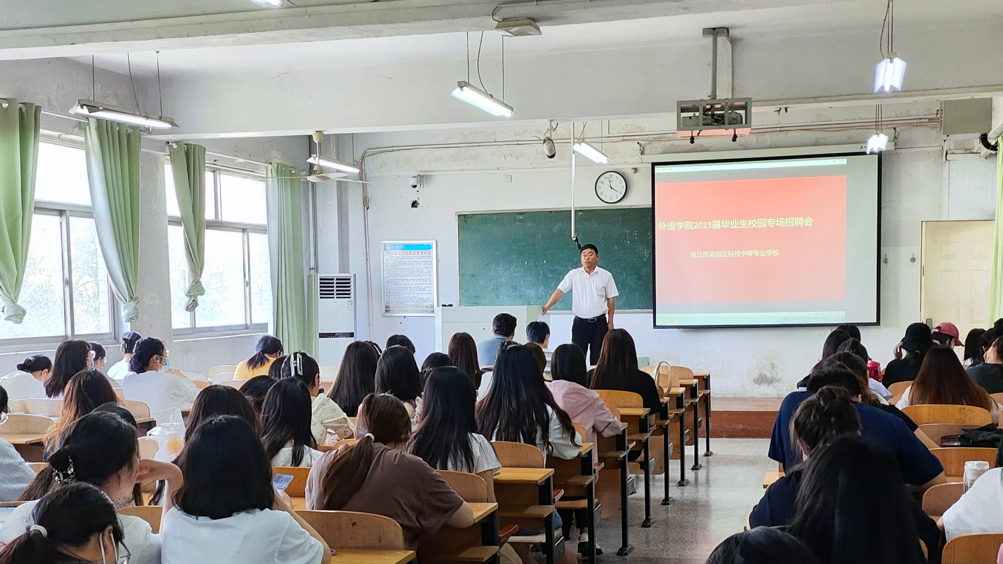 为促进2023届毕业生充分就业,提升就业服务质量,推动就业工作平稳运行。6月7日下午,天天精品视频免费观看于梁园校区智圆楼215教室举行2023届毕业生校园专场招聘会,本次招聘会由辅导员郭继鹏老师主持,2023届英语专业毕业生100余人参加,用人单位为商丘市梁园区科技中等专业学校。