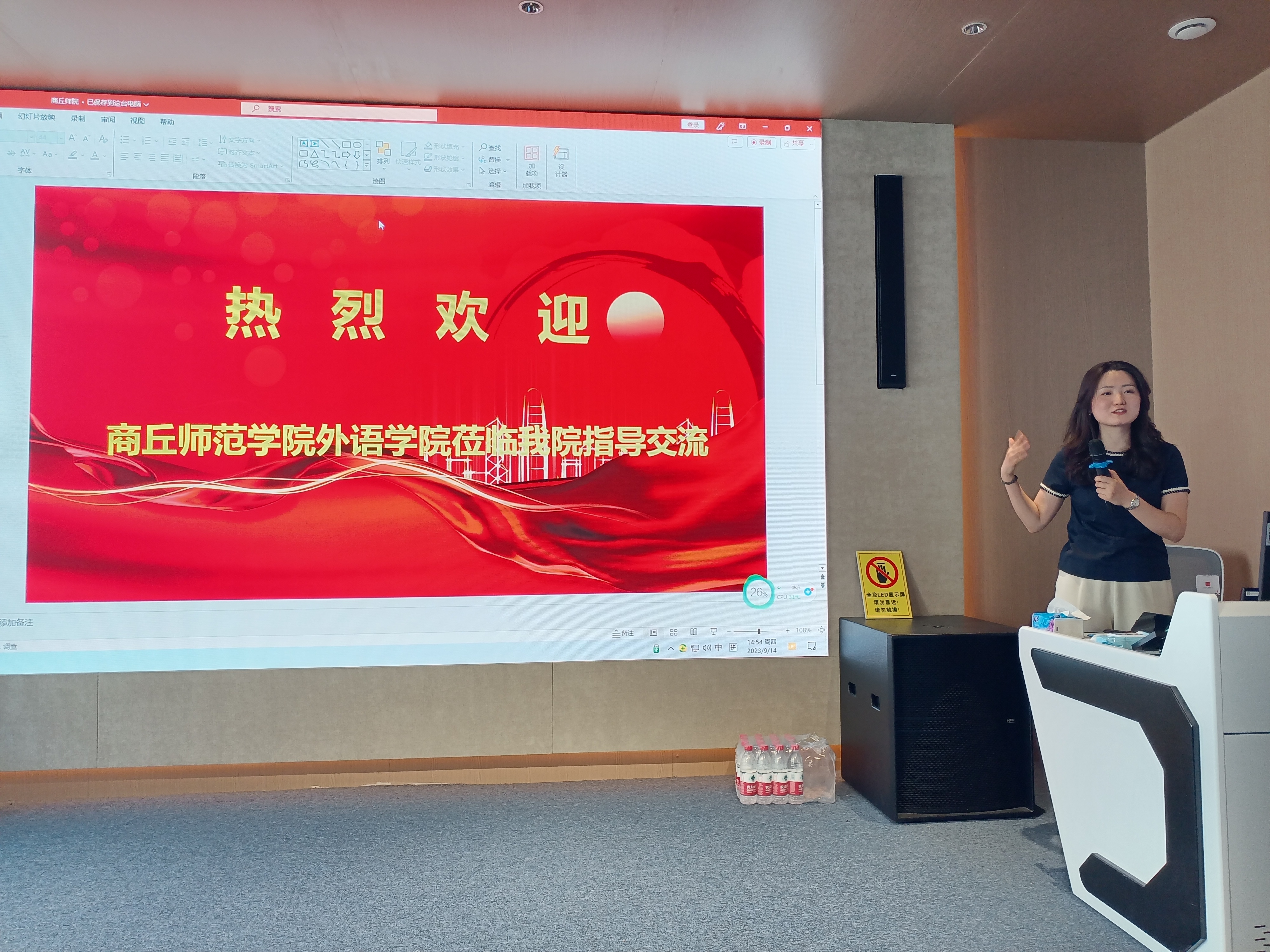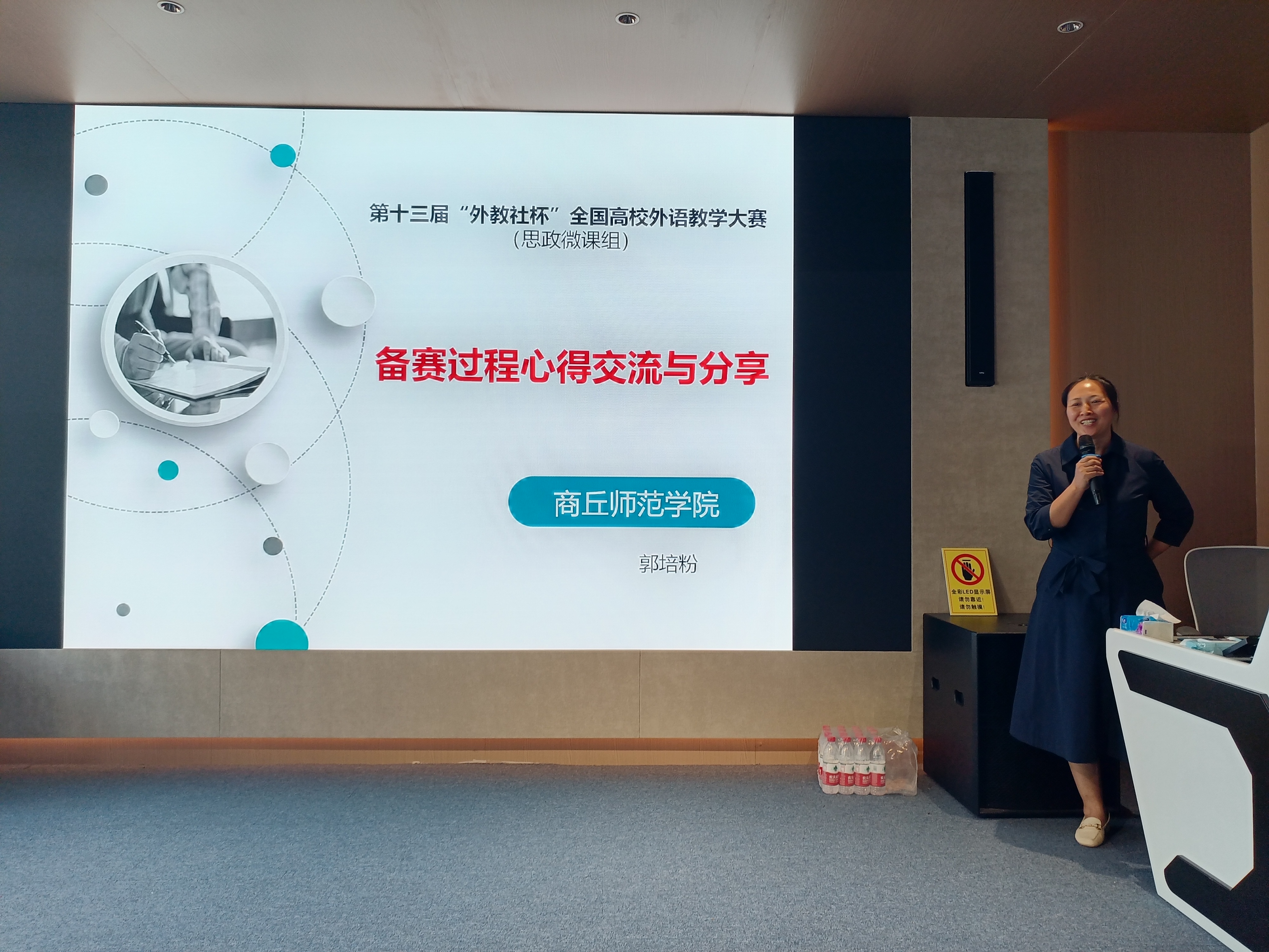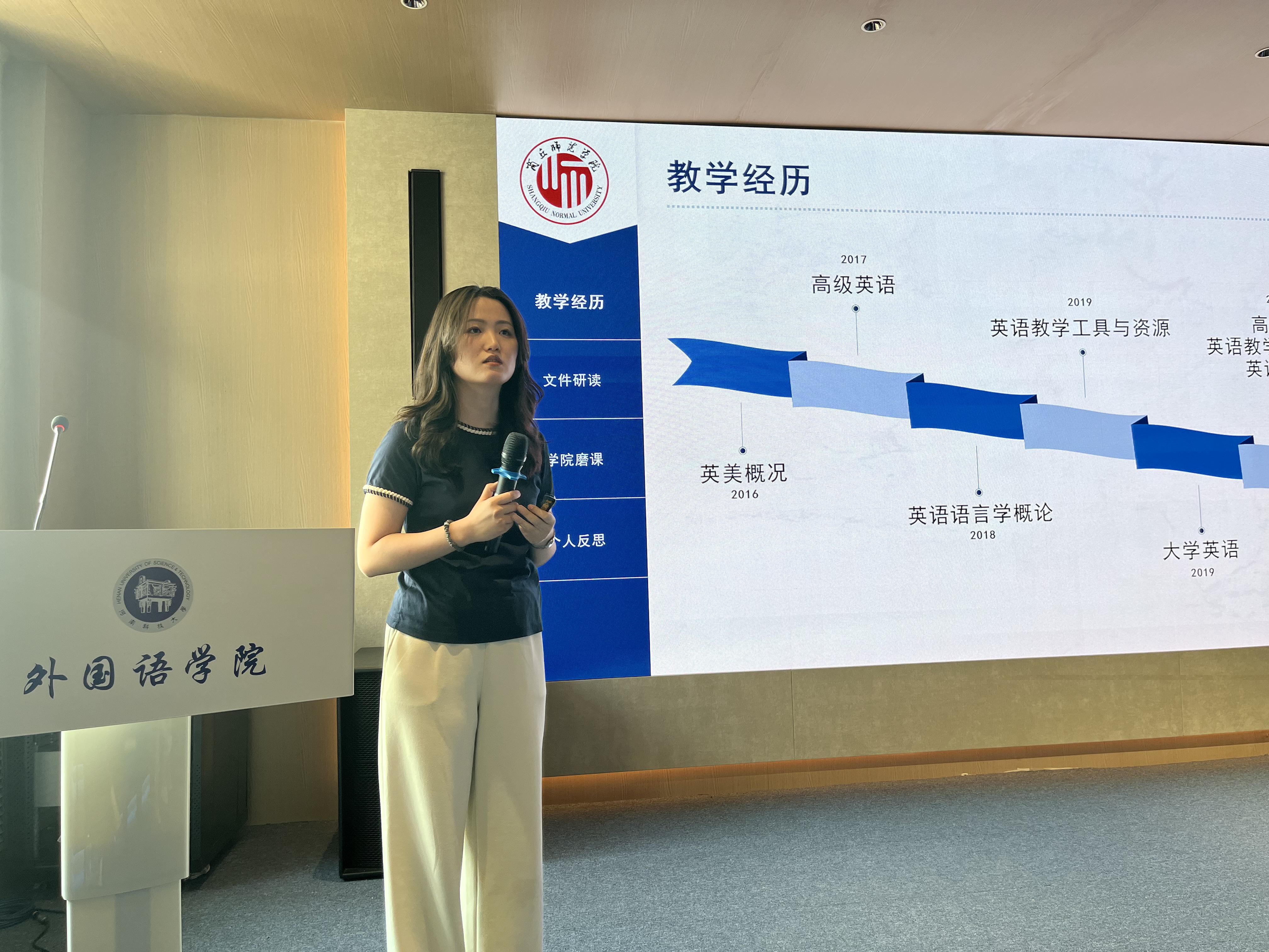 下午,在河南科技大学外国语学院报告厅,张晗、郭培粉、黄明三位教师分别展示了全国高校外语教学大赛河南赛区视听说组特等奖、微课组一等奖和外研社“教学之星”大赛河南省特等奖的教学案例,并分享了备赛和参赛的心得体会,最后,三位老师与河南科技大学外国语学院教师就课程教学、教学竞赛等教学问题进行了现场交流。